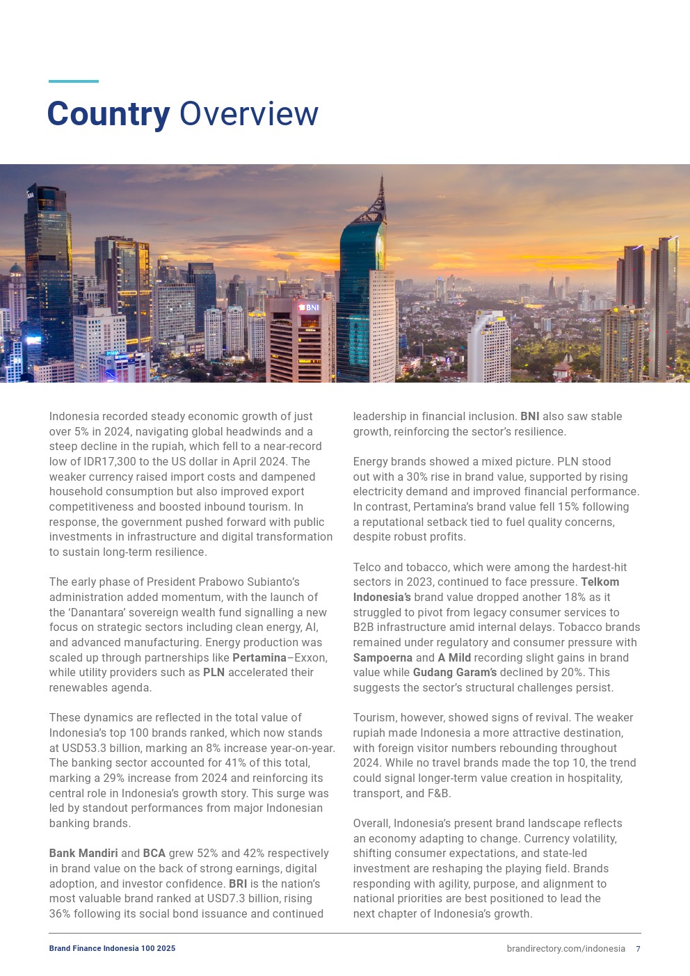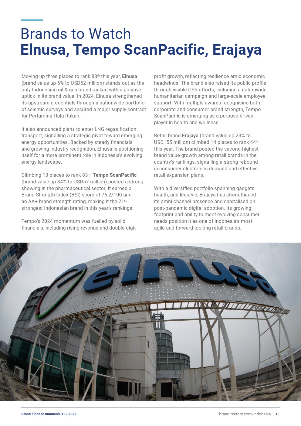 Pertamina(品牌价值下降15%,达到38亿美元)今年下滑两位至第四名。尽管产量增加,但在能源需求疲软和市场环境严峻的背景下,收入低于预期导致排名下降。