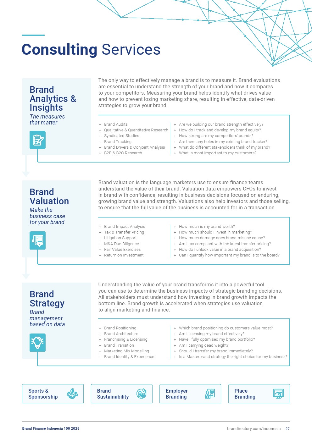 PLN上升两位至第八名,品牌价值增长30%,达到23亿美元,成为印尼最具价值的公用事业品牌。这一增长源于电力需求上升、消费扩大和运营改善,体现在2024年强劲的销售和收入增长上。