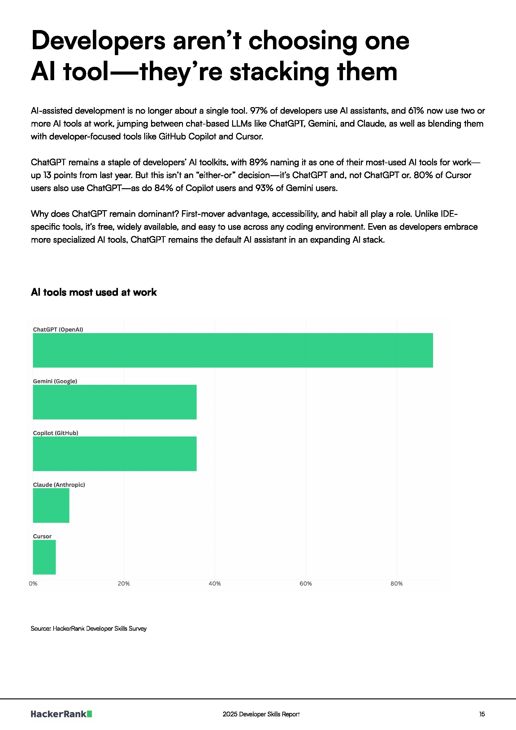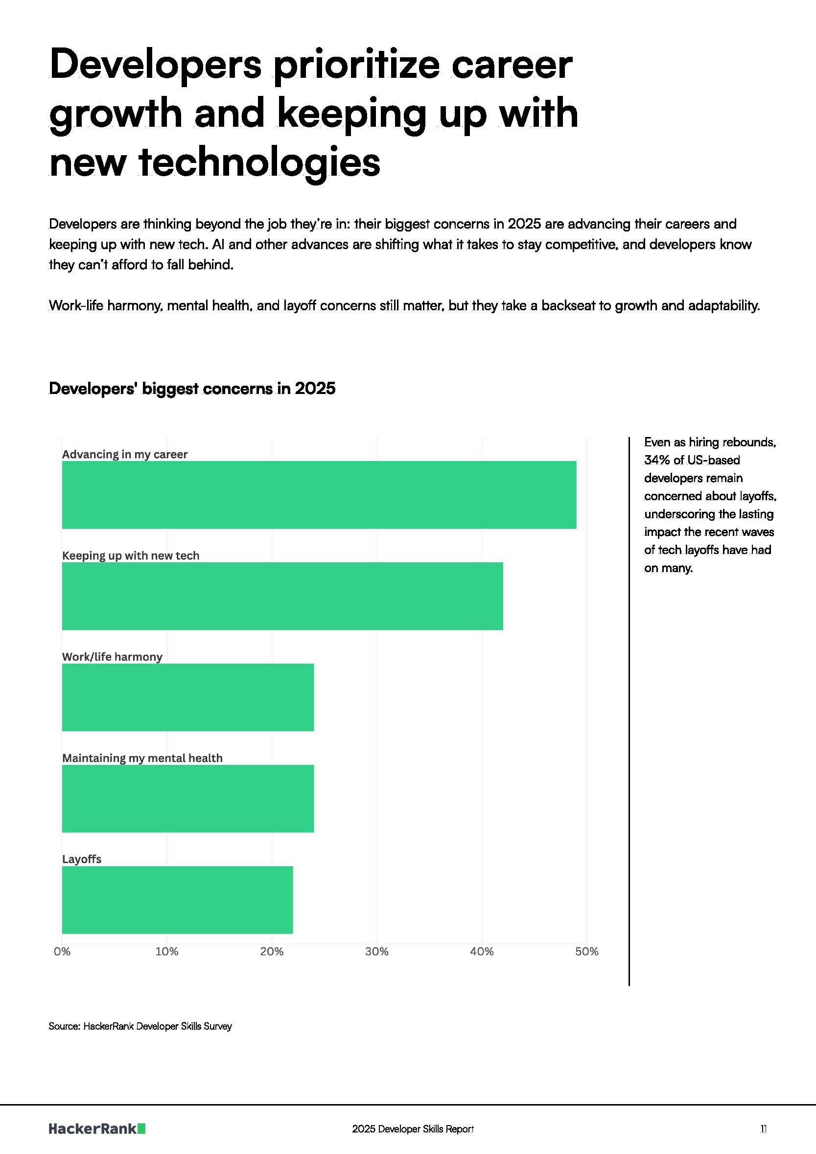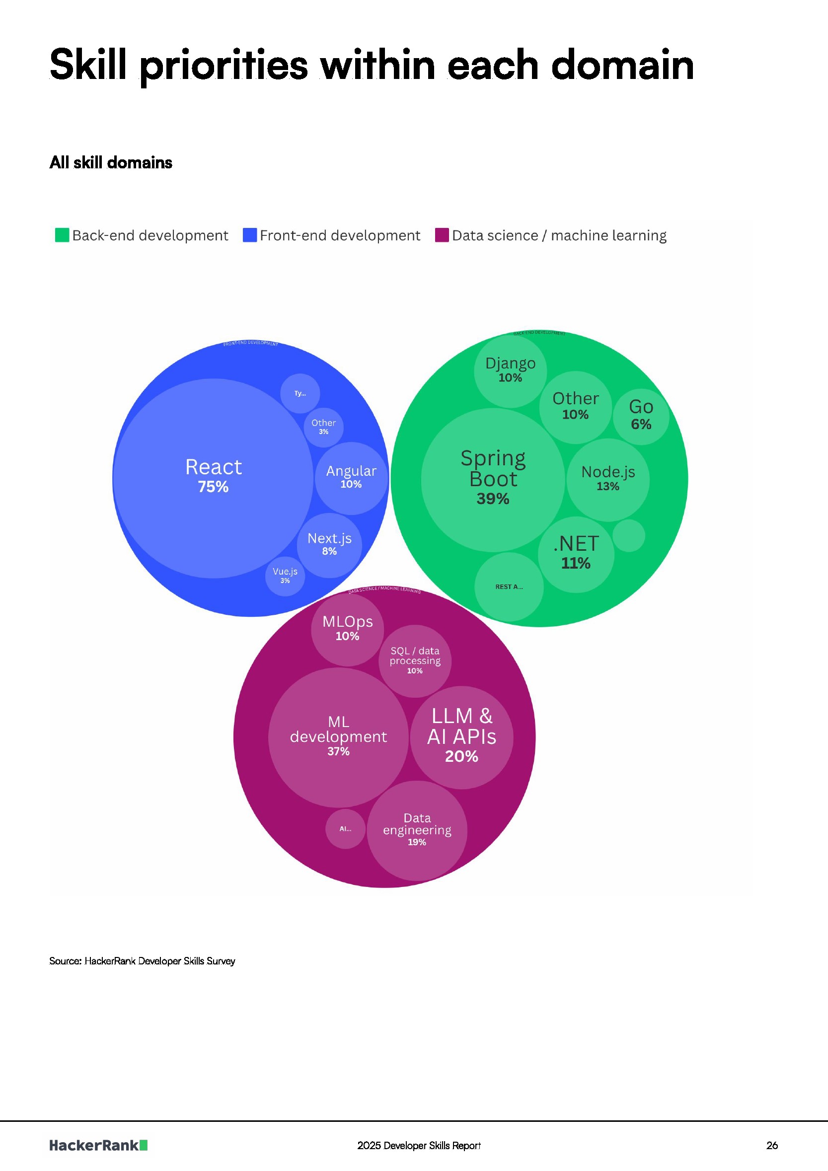 HackerRank发布了“2025年开发人员技能报告”。HackerRank 建立在一个简单的理念之上:技能应比背景更重要。其帮助公司基于真实能力而非简历关键词来招聘和发展开发人才,并支持一个拥有2600多万开发者的社区追求他们的全部潜力。