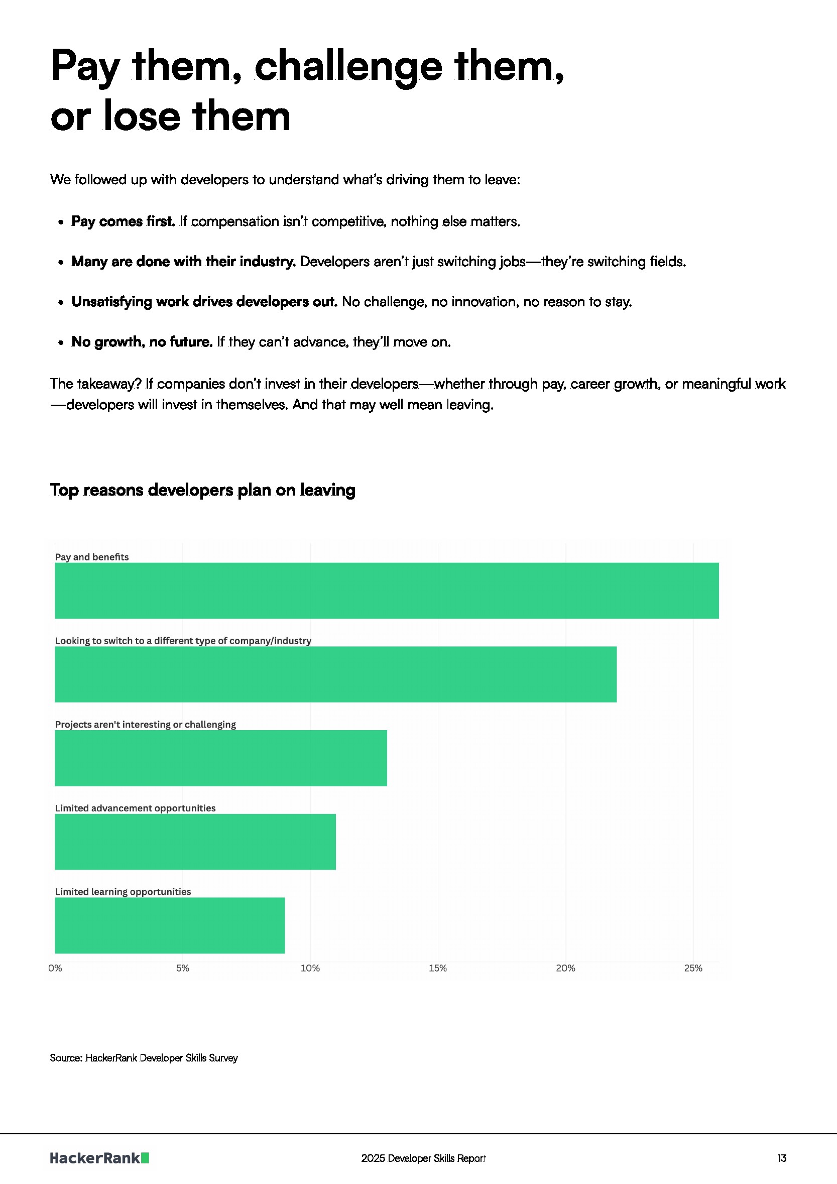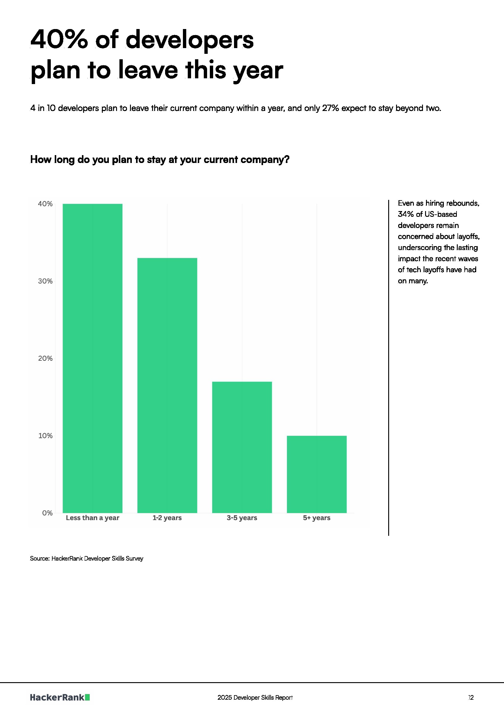 开发者不会等待公司投资他们。40%的人计划在一年内离职,优先考虑职业成长和技能发展。