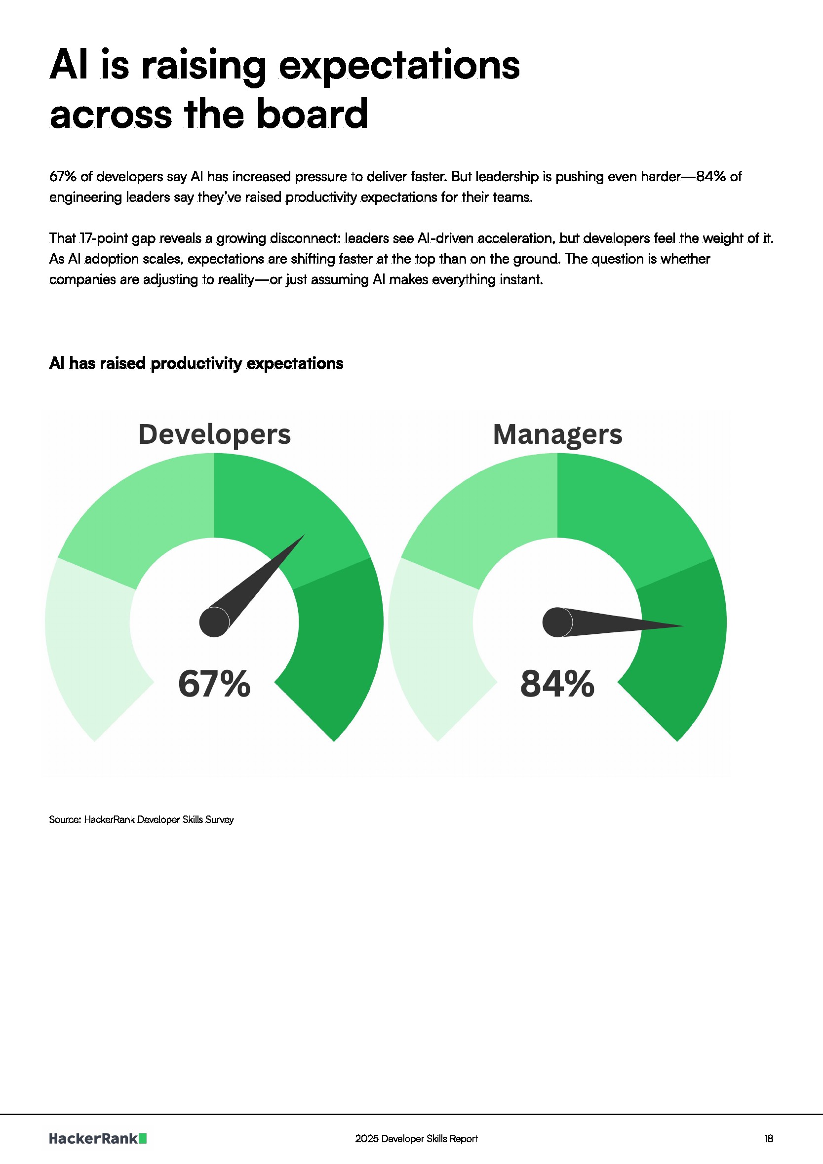 与此同时,人工智能正在重塑开发工作并重新定义绩效。它让开发者更快,但并非人人平等。随意使用人工智能的用户与深度采用者之间的差距正在扩大,重度人工智能用户报告的生产力增益显著更高。同时,67%的开发者表示人工智能增加了更快交付的压力,而领导者们正在以更高的速度提升期望。