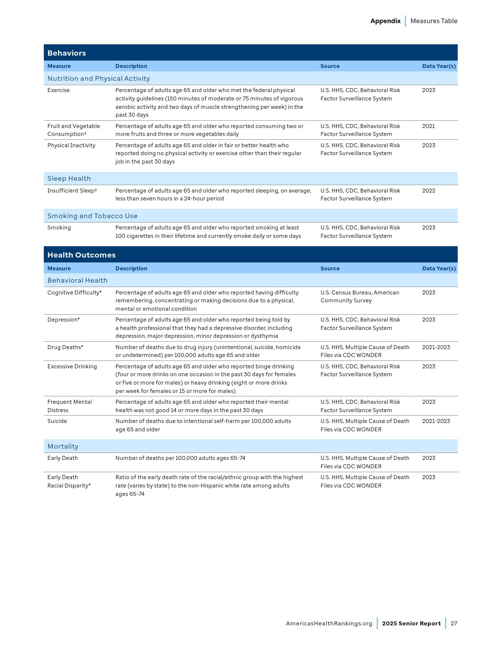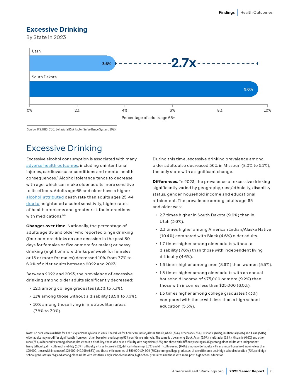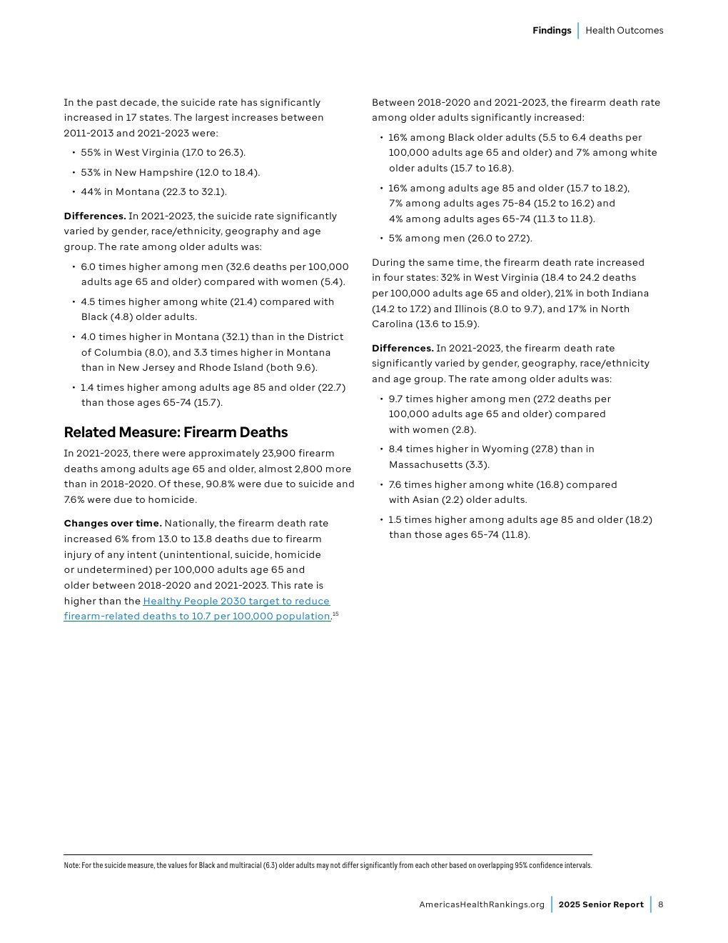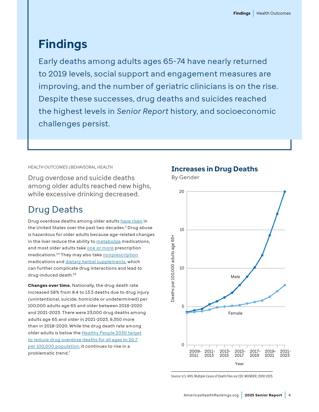 时间变化趋势。2018-2020年至2021-2023年间,全美65岁及以上老年人药物致死率(包含意外、自杀、他杀或未确定原因的药物伤害)从每10万人8.4例上升至13.3例,增幅达58%。2021-2023年期间65岁及以上老年人药物致死人数达23,000例,较2018-2020年增加9,350例。虽然老年人药物致死率仍低于“健康人民2030”设定的全年龄段药物过量致死率控制目标(每10万人20.7例),但其持续上升趋势值得警惕。