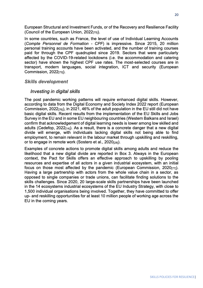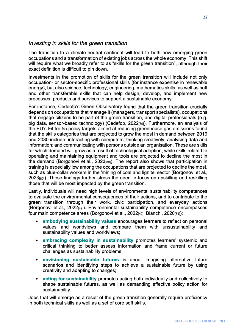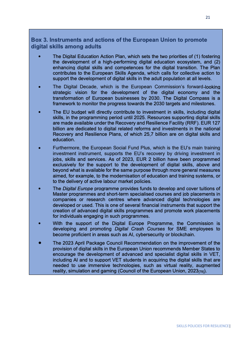 绿色转型为就业带来机遇,国际劳工组织(ILO)测算至2030年全球可新增2050万个绿色岗位。欧盟“Fit for 55”政策包预计将带来100-250万净增岗位。欧盟恢复基金1270亿欧元投向数字领域,其中257亿欧元专用于数字技能;ESF+另为数字技能单列20亿欧元。