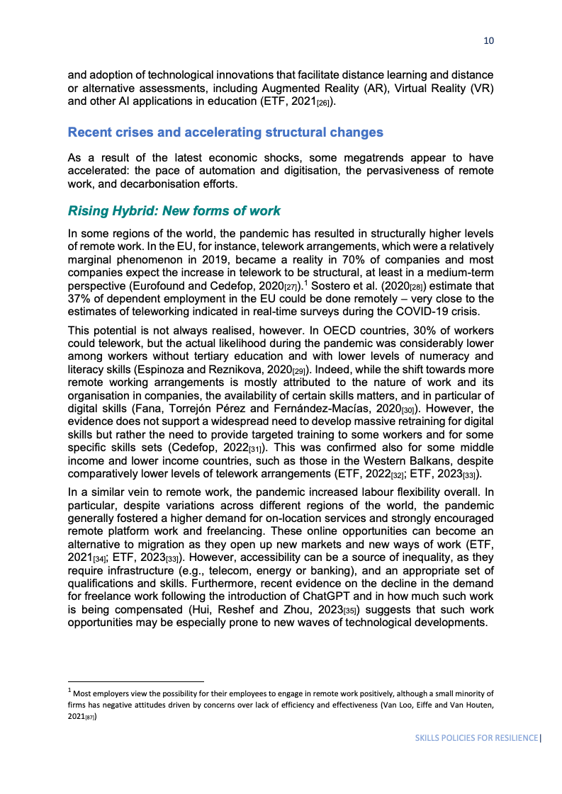 数字转型加速,39%的欧盟劳动者在疫情中提高了数字工具使用频率,其中高级岗位提升51%,体力岗位仅20%。数字鸿沟放大不平等,理论上30%劳动者可远程工作,但低学历、低数字技能者实际远程概率远低于高技能者,凸显技能结构性短缺。自动化进程也加速了就业极化趋势。