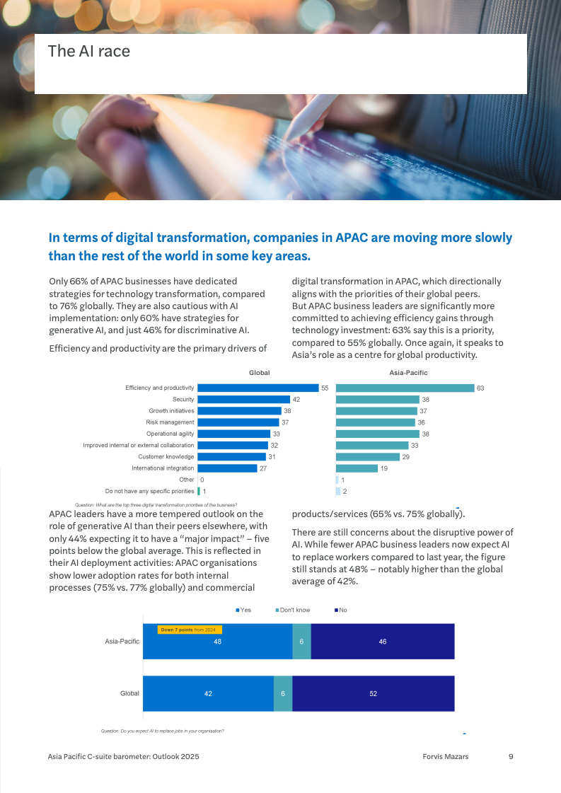 在人工智能的应用上,亚太地区呈现出一种独特的双重悖论。一方面,高达63%的企业将提升效率与生产力作为技术投资的首要驱动力,高于全球55%的水平。但另一方面,仅有66%的企业制定了明确的技术转型战略,落后于全球的76%。对于生成式AI的颠覆性潜力,亚太区领导者也更为冷静,仅44%认为其会产生“重大影响”,但同时,48%的人预计AI将取代部分工作岗位,这一比例反而高于全球的42%。