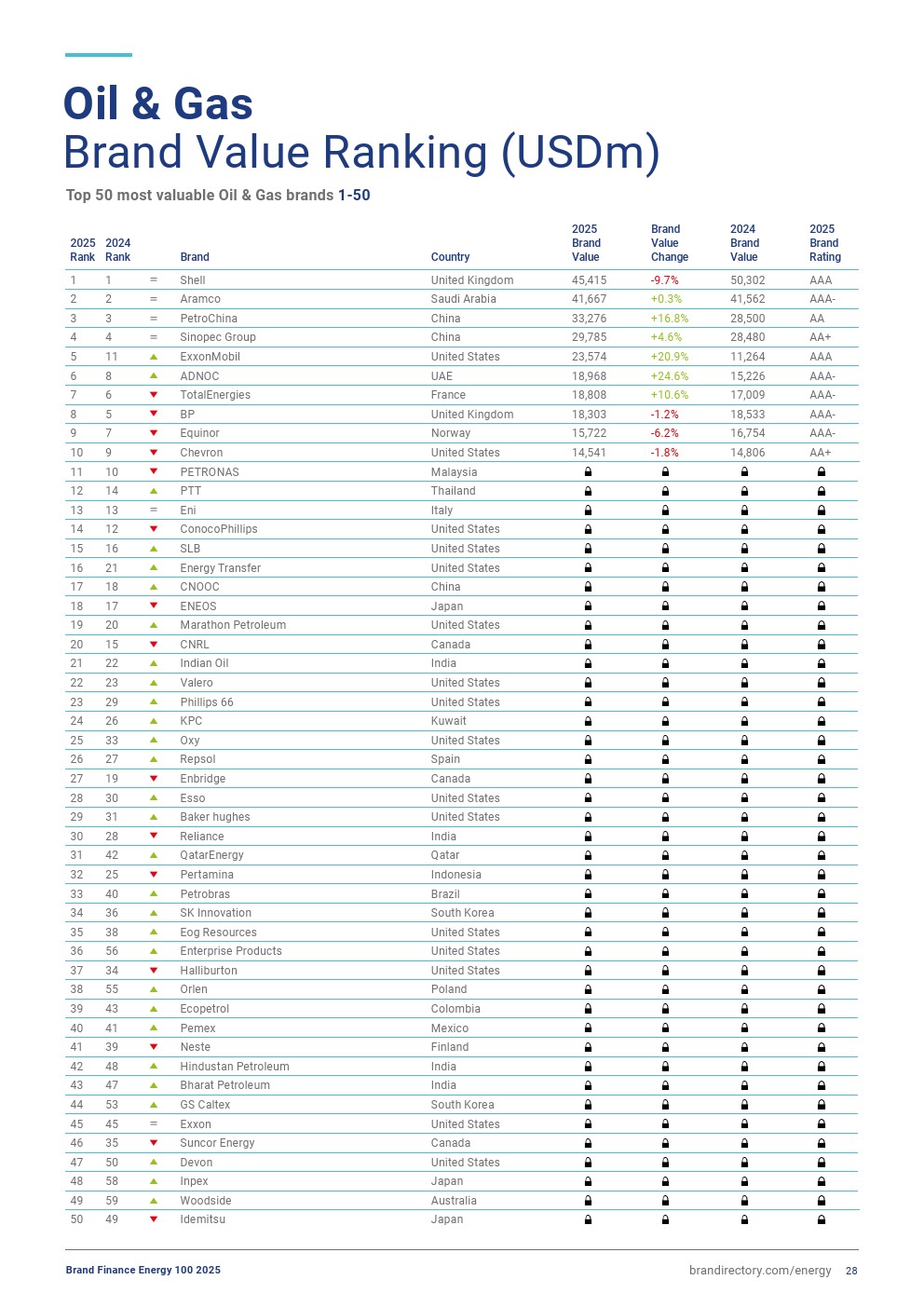 阿布扎比国家石油公司(ADNOC,品牌价值增长25%,达到190亿美元)排名上升,现为全球第六大油气品牌。