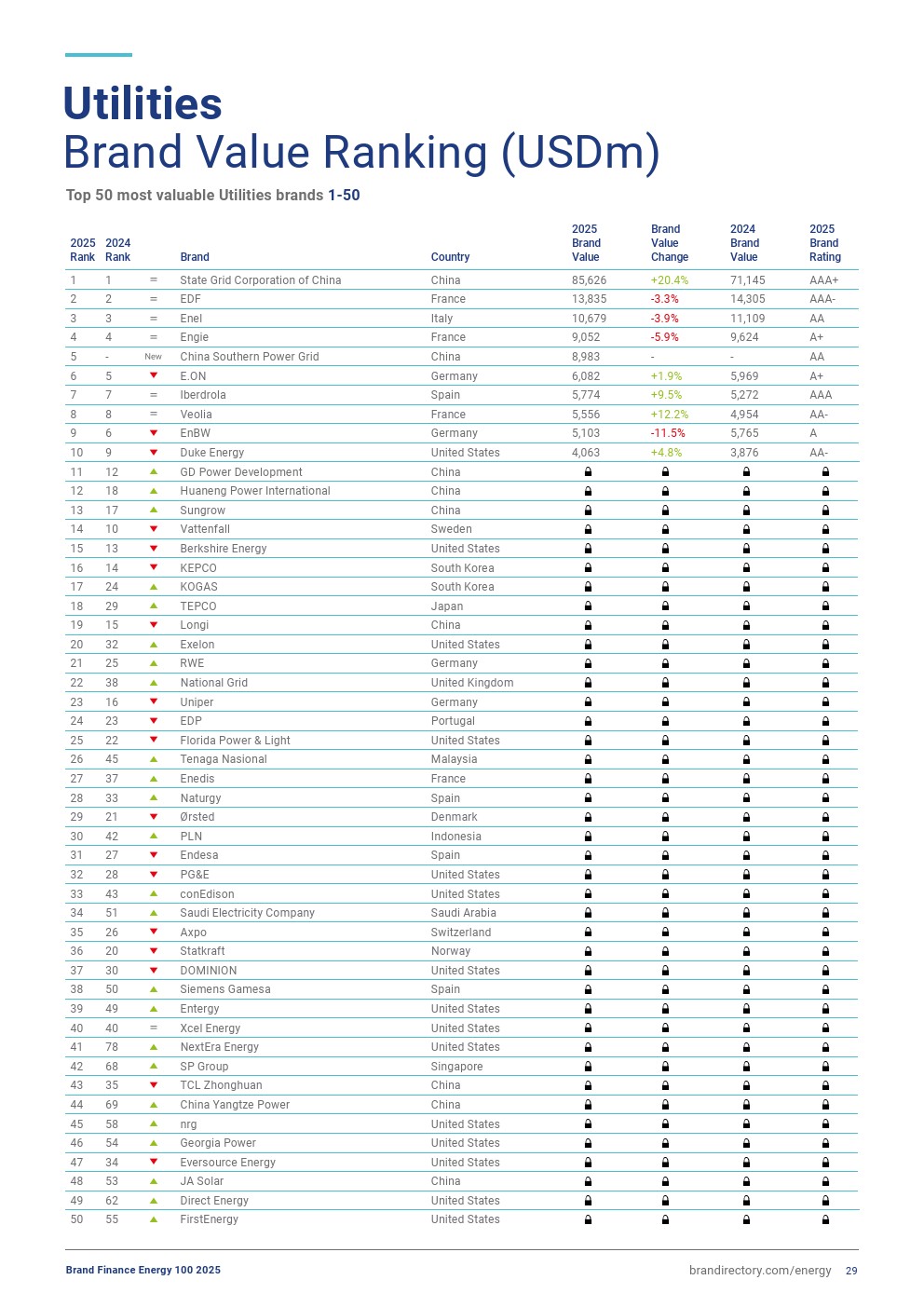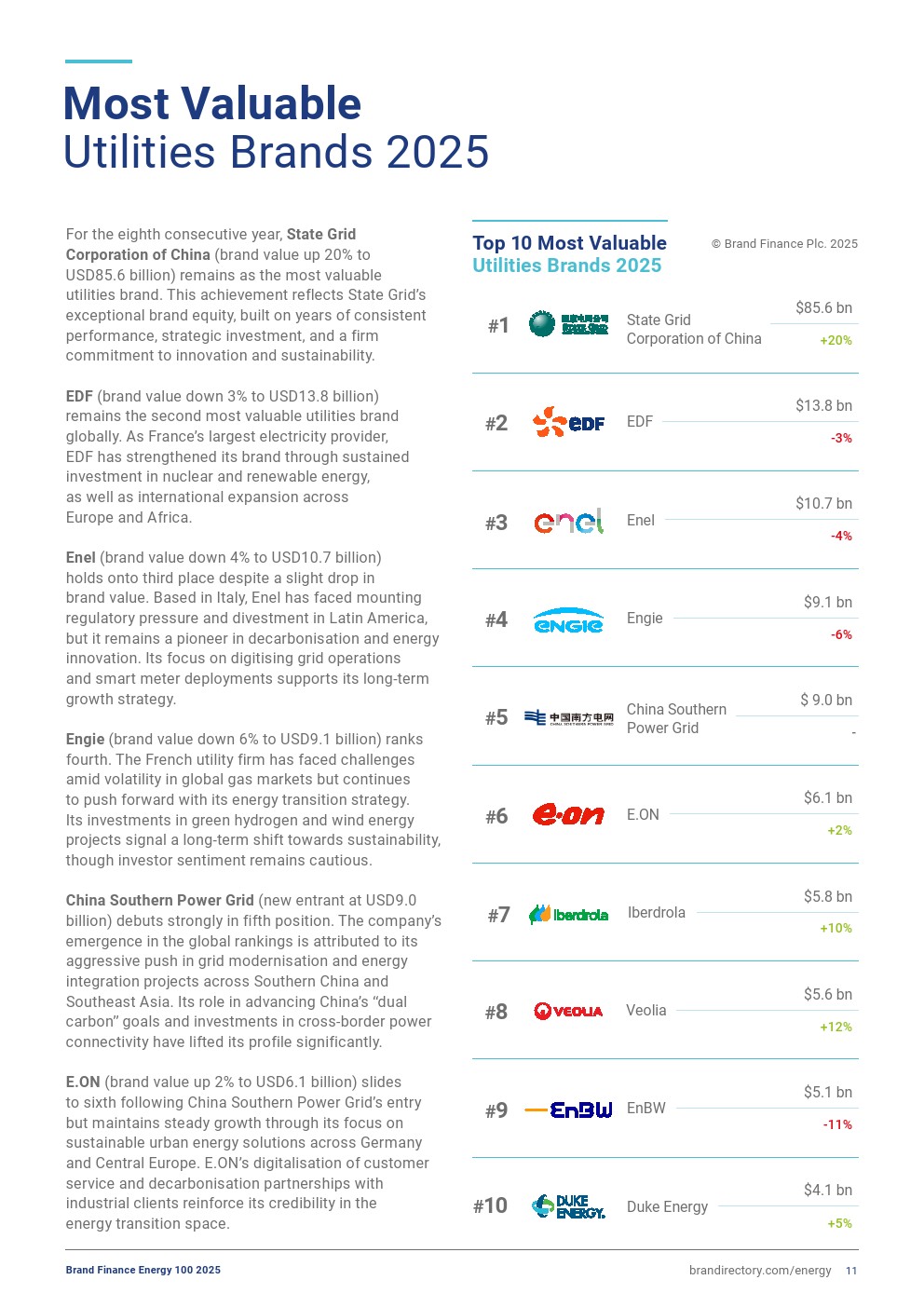 美国杜克能源(Duke Energy,品牌价值增长5%,达到41亿美元)凭借客户可靠性、智能电网升级及明确脱碳路线图跻身前十。