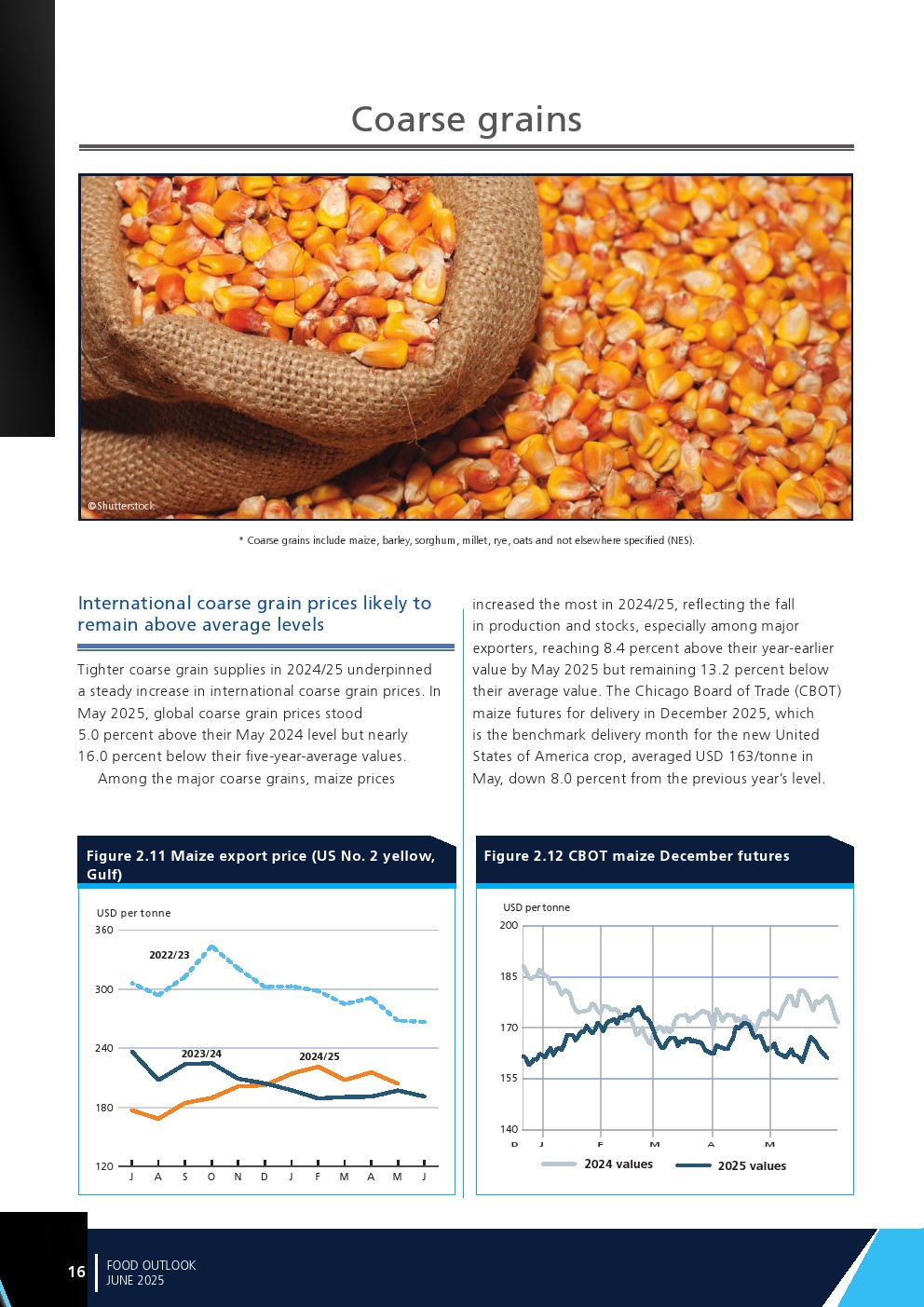 经历2024/25年度供应紧张后,粗粮价格(受玉米价格走高主导)在2025/26年度初仍高于平均水平。粮农组织初步预测显示,随着产量预期回升,2025/26年度全球粗粮供应可能增加,这将推动全球库存水平部分恢复。