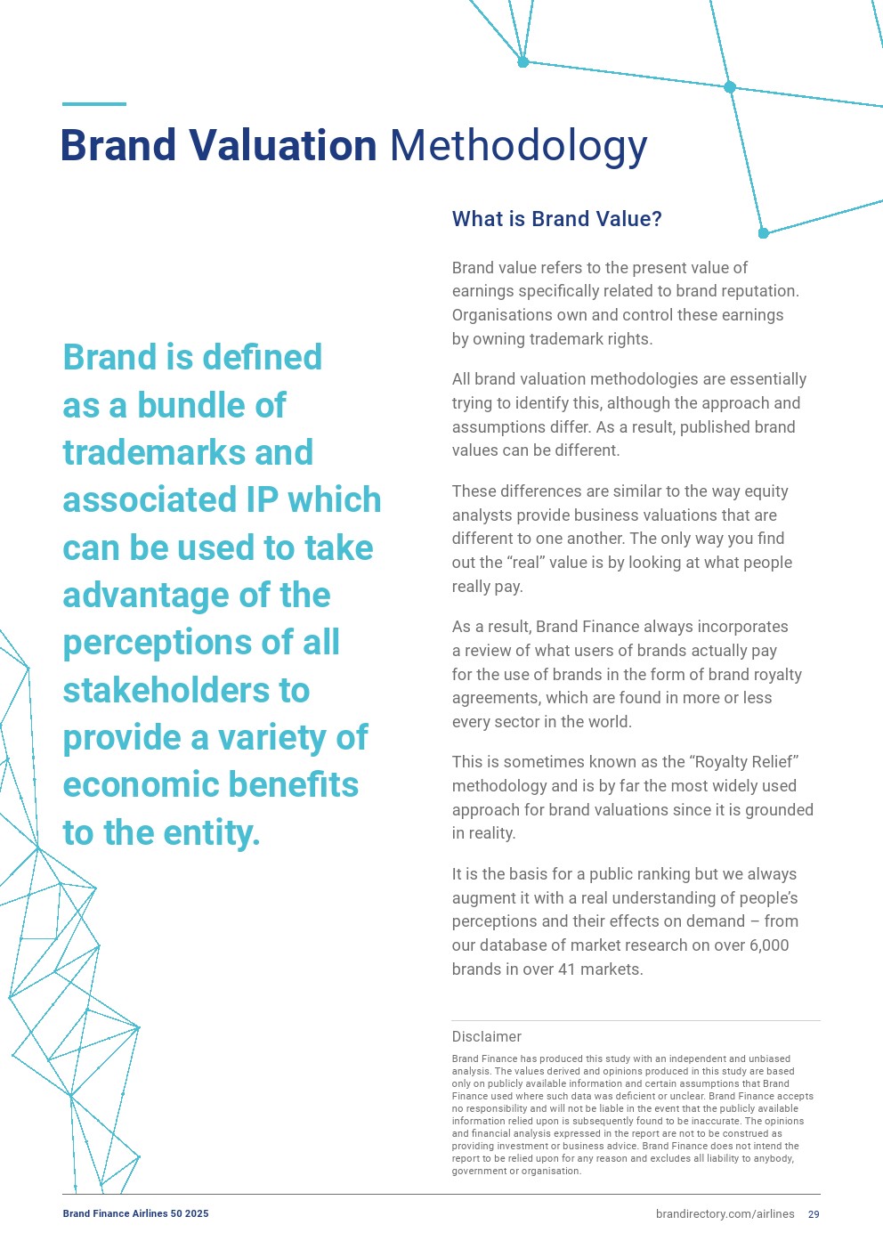全球前50大航空品牌总价值达到1326亿美元,反映出疫情后强劲复苏及加强品牌资产、扩大航线网络和提升客户体验的战略努力。美国航空公司继续主导排名前列,前五大航空品牌中有三家总部位于美国,合计占前十名总价值的一半以上。