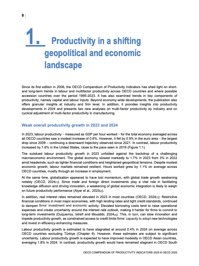 全球生产力增长呈现低迷态势。2023年OECD经济体劳动生产率平均仅增长0.6%,而欧元区则录得负0.9%的显著下滑,为2009年金融危机以来的最差表现。增长动力主要源于劳动投入量的增加,而非效率提升。多要素生产率(MFP)的停滞乃至负增长,以及资本深化贡献的微弱,是导致这一疲软局面的核心驱动因素。