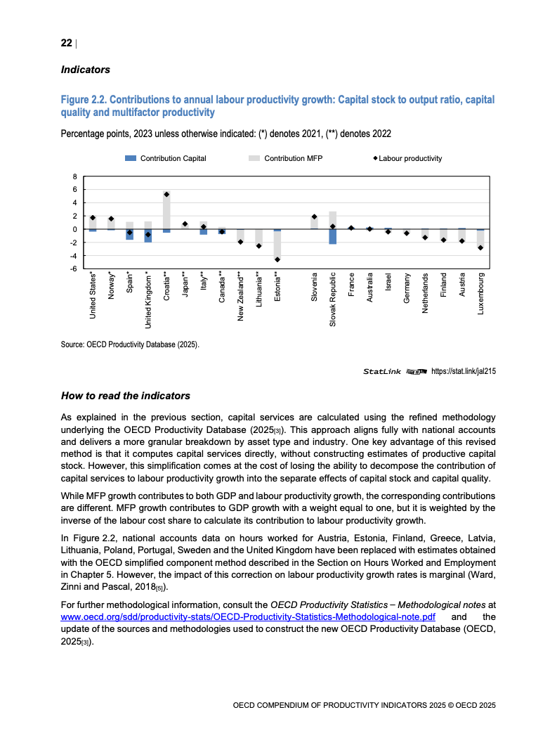 从跨国比较视角看,经购买力平价(PPP)调整后,美国占OECD总GDP的34%。尽管自2000年以来成员国生产率水平存在趋同趋势,但国别差异依然悬殊,最高与最低水平国家相差近六倍。这些差异更多由营商环境、监管框架等长期结构性因素决定,而非短期经济周期波动。