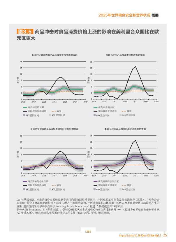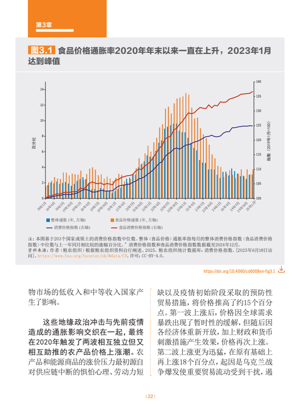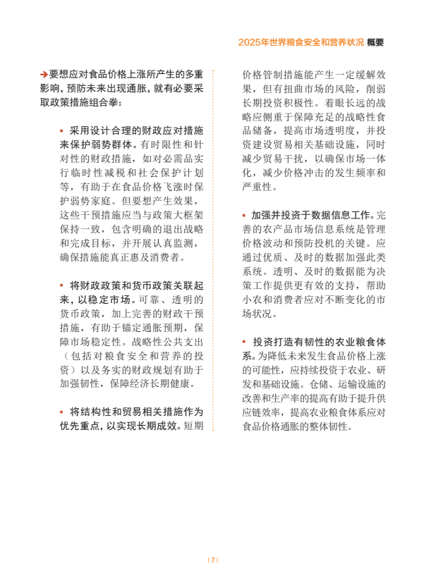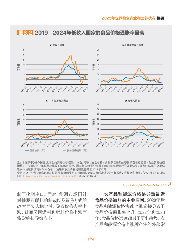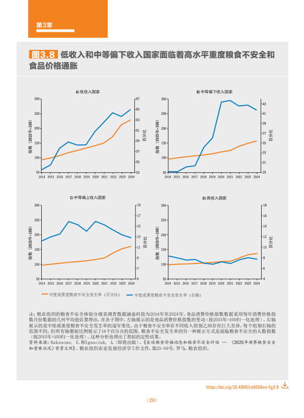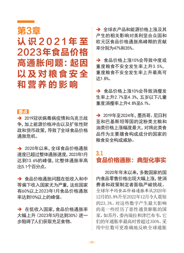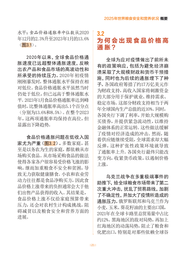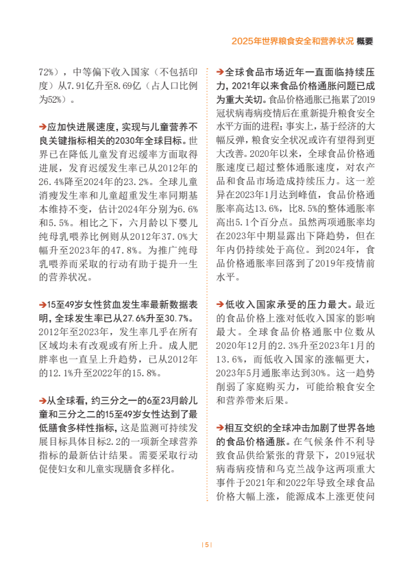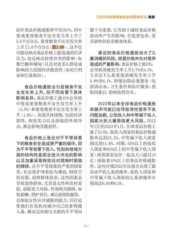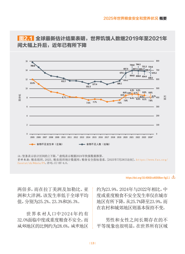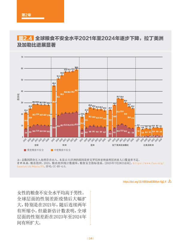 估计2024年世界上约有23亿人面临中度或重度粮食不安全。全球中度或重度粮食不安全发生率自2021年以来一直逐步下降,2024年28.0%。非洲的粮食不安全水平在上升,拉丁美洲及加勒比在下降,亚洲已连续几年逐步下降,而在大洋洲和北美及欧洲,最新估计值表明继几年上升趋势后2023年至2024年出现了小幅下降。在全球层面以及在几乎所有区域,农村地区的粮食不安全状况比城市地区更为普遍,且受其影响的女性多于男性。