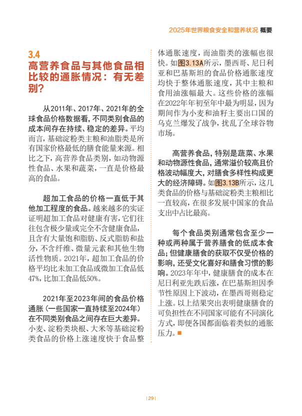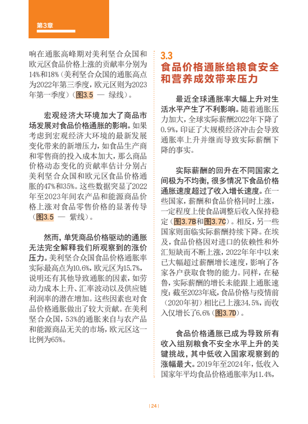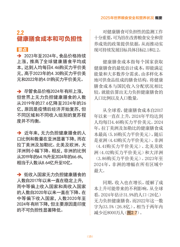 2023年至2024年,食品价格持续上涨,推高了全球健康膳食平均成本,达到人均每日4.46购买力平价美元,高于2023年的4.30购买力平价美元和2022年的4.01购买力平价美元。