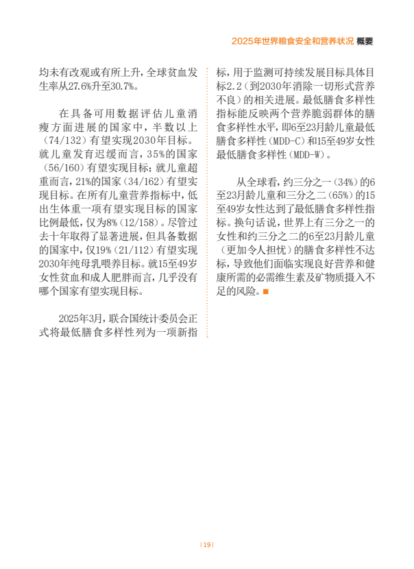 从全球看,约三分之一的6至23月龄儿童和三分之二的15至49岁女性达到了最低膳食多样性指标,这是监测可持续发展目标具体目标2.2的一项新全球营养指标的最新估计结果。需要采取行动促使妇女和儿童实现膳食多样化。