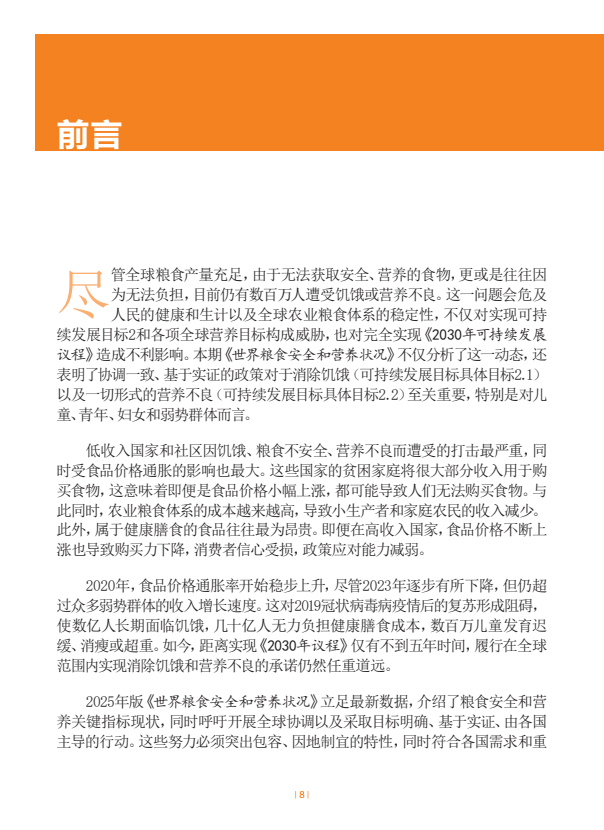 最新全球估计数据表明,世界饥饿人口比例近年有下降迹象。估计2024年全球人口中有8.2%面临饥饿,低于2023年的8.5%和2022年的8.7%。取得进展的原因是东南亚、南亚和南美洲取得显著改善,而相比之下非洲多数次区域和西亚的饥饿人数则在持续上升。