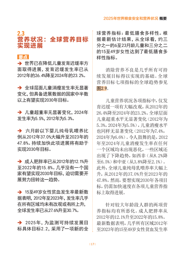 应加快进展速度,实现与儿童营养不良关键指标相关的2030年全球目标。世界己在降低儿童发育迟缓率方面取得进展,发育迟缓发生率已从2012年的26.4%降至2024年的23.2%。全球儿童消瘦发生率和儿童超重发生率同期基本维持不变,估计2024年分别为6.6%和5.5%。相比之下,六月龄以下婴儿纯母乳喂养比例则从2012年37.0%大幅升至2023年的47.8%。为推广纯母乳喂养而采取的行动有助于提升一生的营养状况。