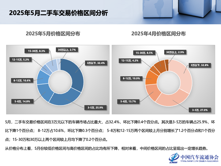 2025年5月,全国二手车市场交易量160.39万辆,环比下降5.72%,同比增长1.22%,交易金额为1029.62亿元。