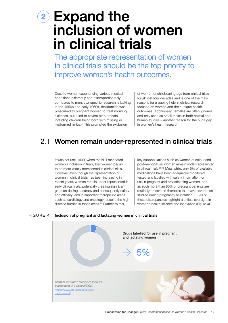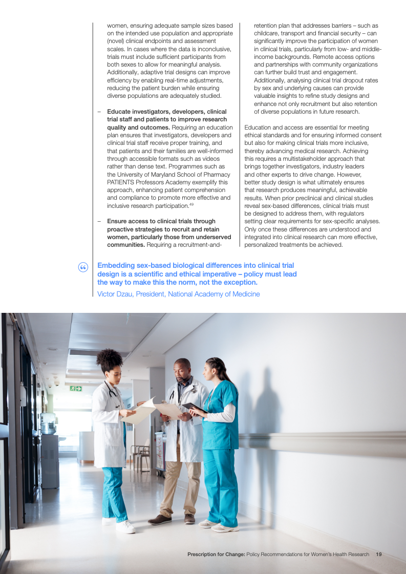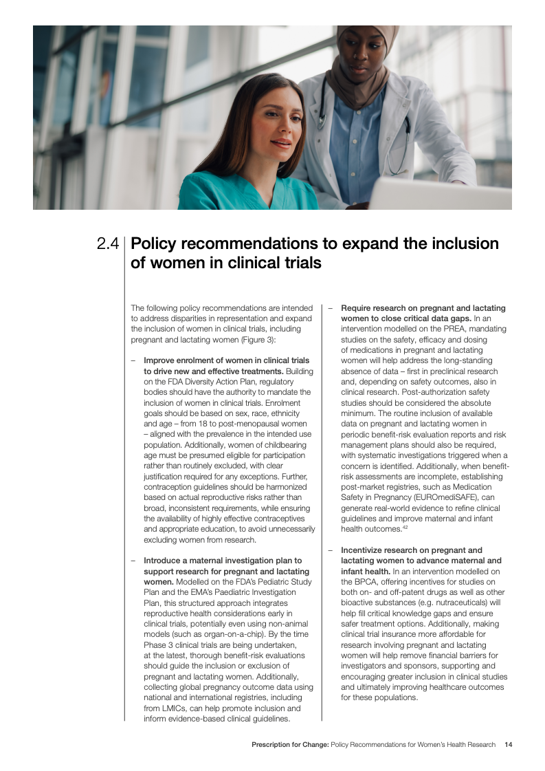 为解决这一差距,文章提出了五项关键政策杠杆:释放女性健康领域的创新潜力,扩大女性在临床试验中的参与规模,改善临床试验数据的性别细分分析,设计以女性为中心的临床试验,以及深化对性别特异性差异的理解。