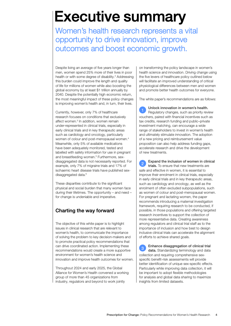 这些政策旨在通过监管改革、财政激励、数据标准化及研究者与患者教育等方式,推动女性健康研究的进步,最终改善全球女性的健康福祉。