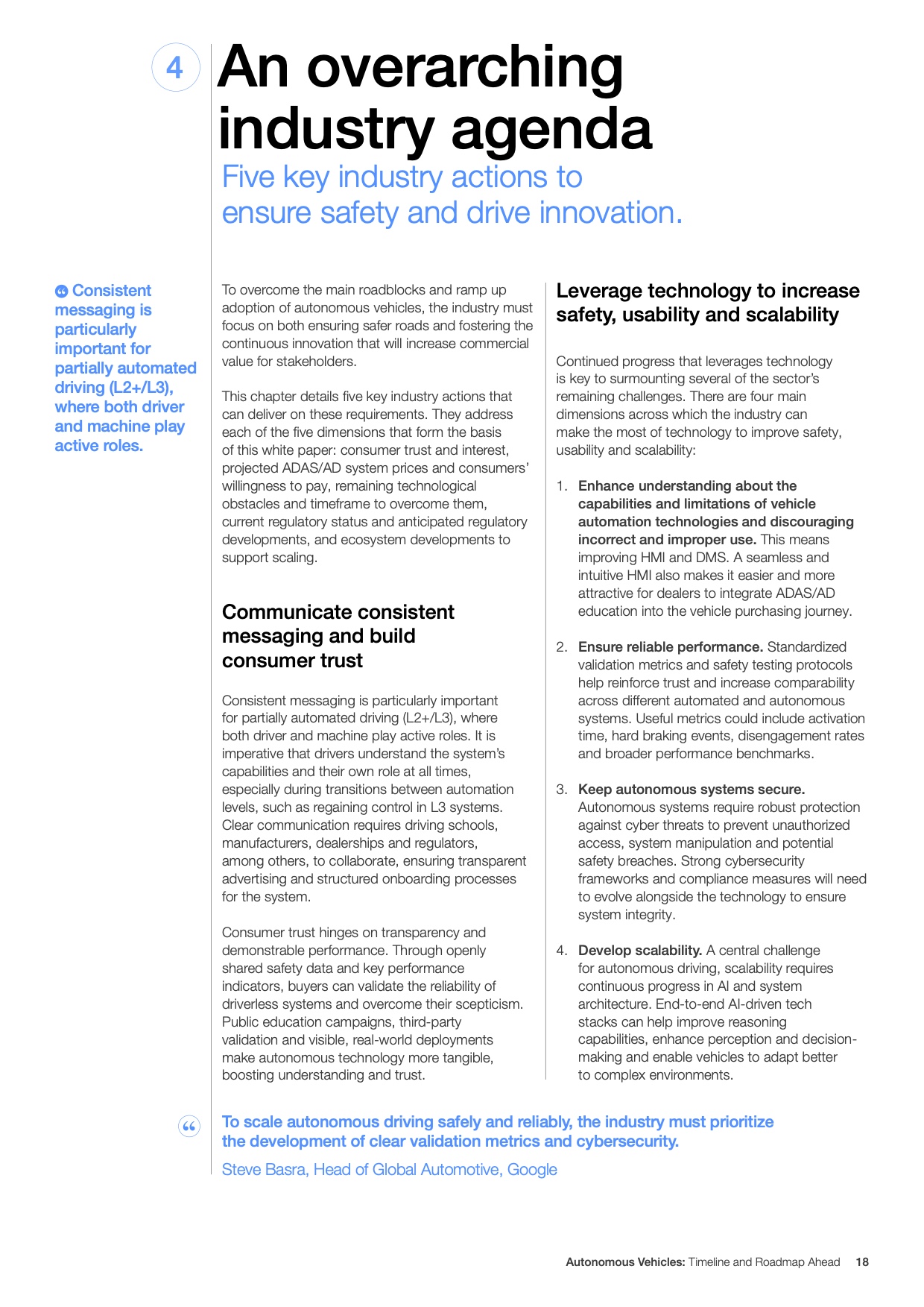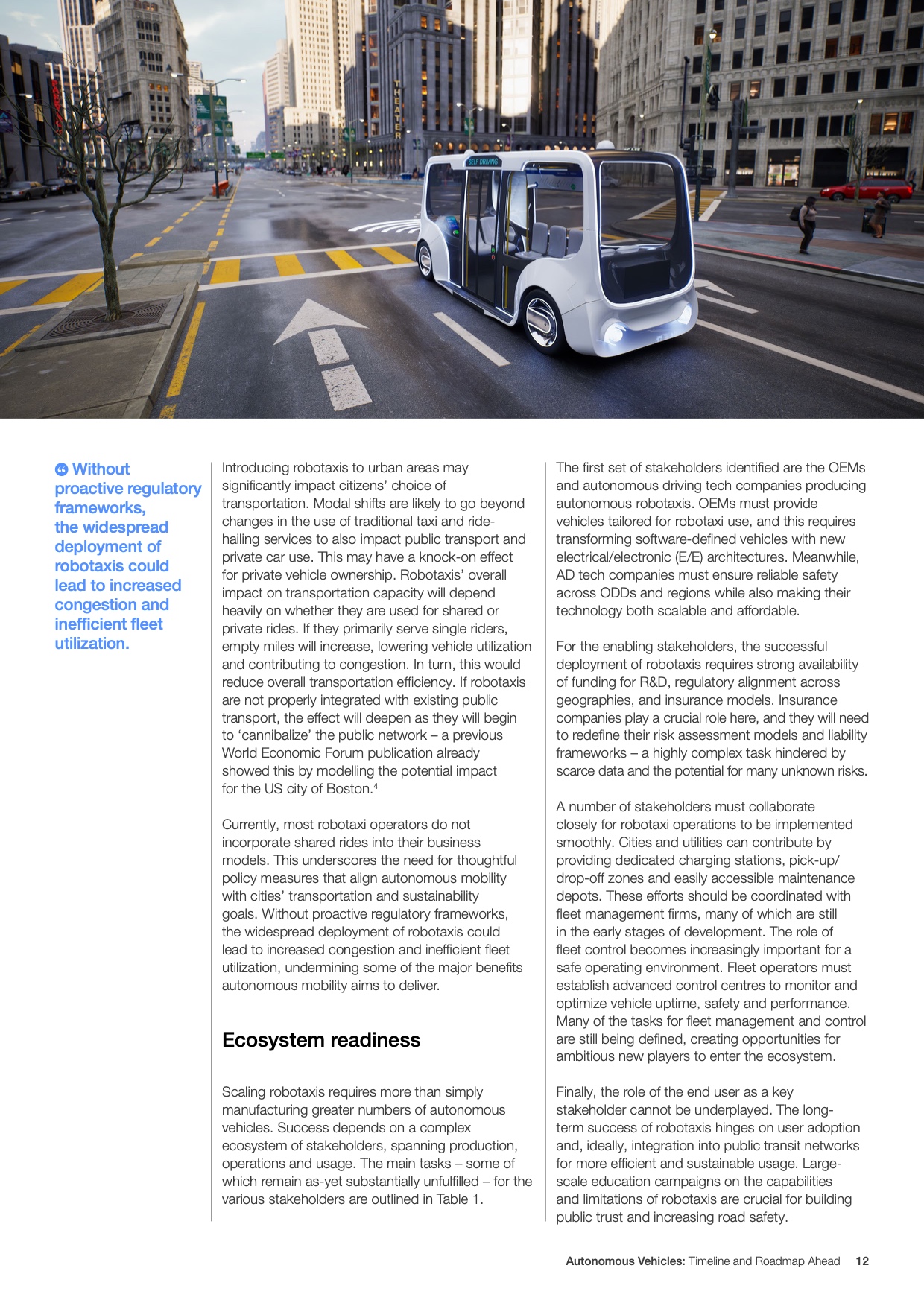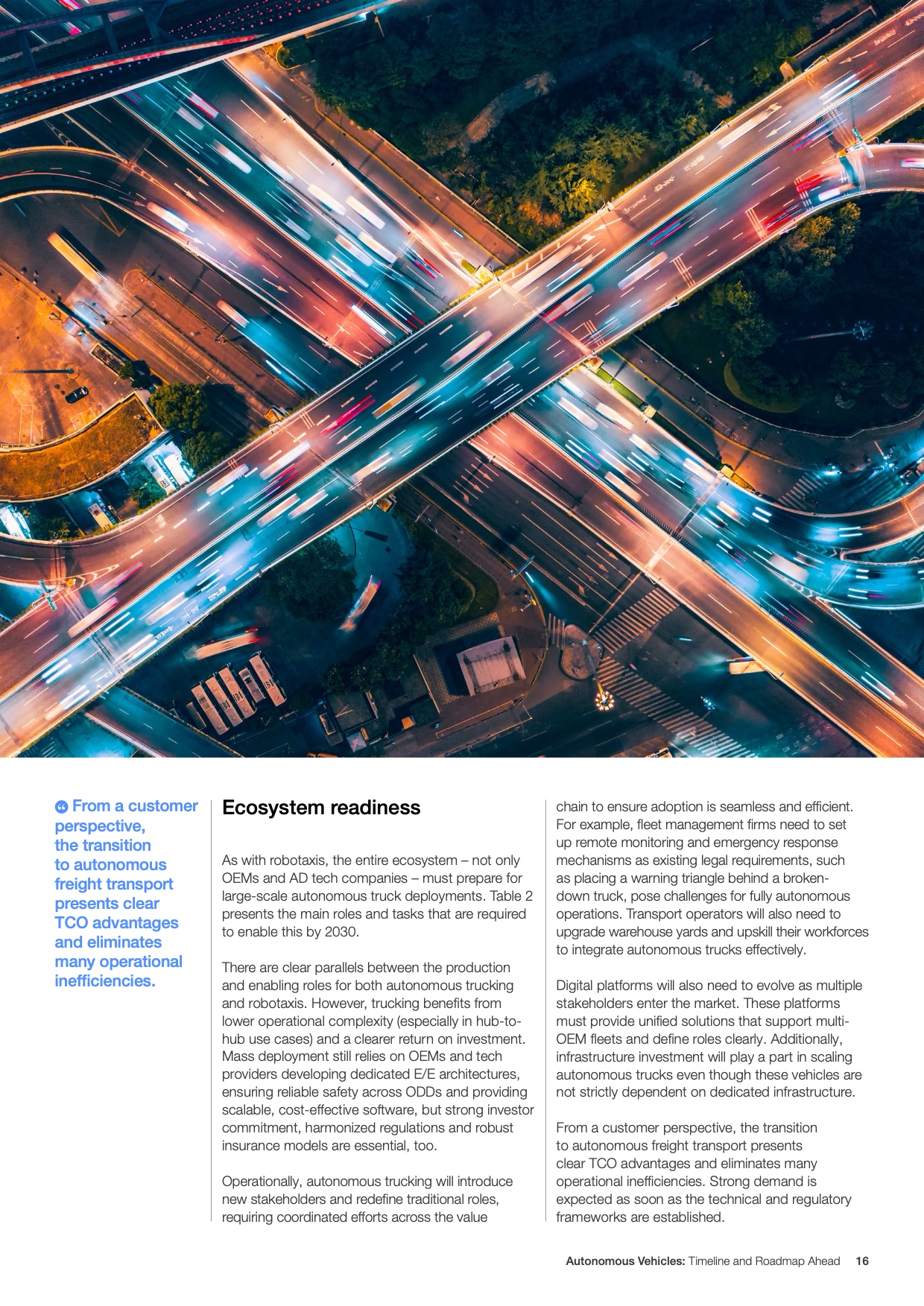 展望未来,自动驾驶技术的规模化部署将受到多重因素制约,包括消费者信任与接受度、系统预测价格与消费者支付意愿、技术障碍及其解决时限、现有监管框架与预期发展,以及支持规模化的生态系统构建。从监管机构到供应商,多方伙伴的协调合作是充分发挥自动驾驶潜力的关键。