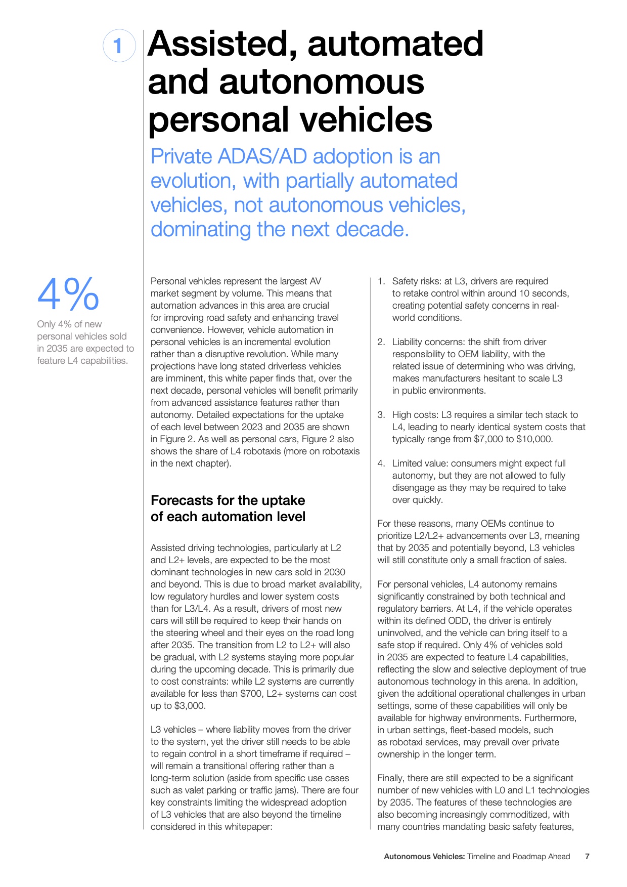 针对私家车市场,报告预测自动化将是渐进式演变而非革命性突破。到2030年,L2和L2+级别的高级辅助驾驶功能可能在新车中占据最主要地位。白皮书强调,在2035年之后很长一段时间内,大多数新车的驾驶员仍需手动操控,L4级自动驾驶仍受技术、法规及高昂成本的严重限制。
