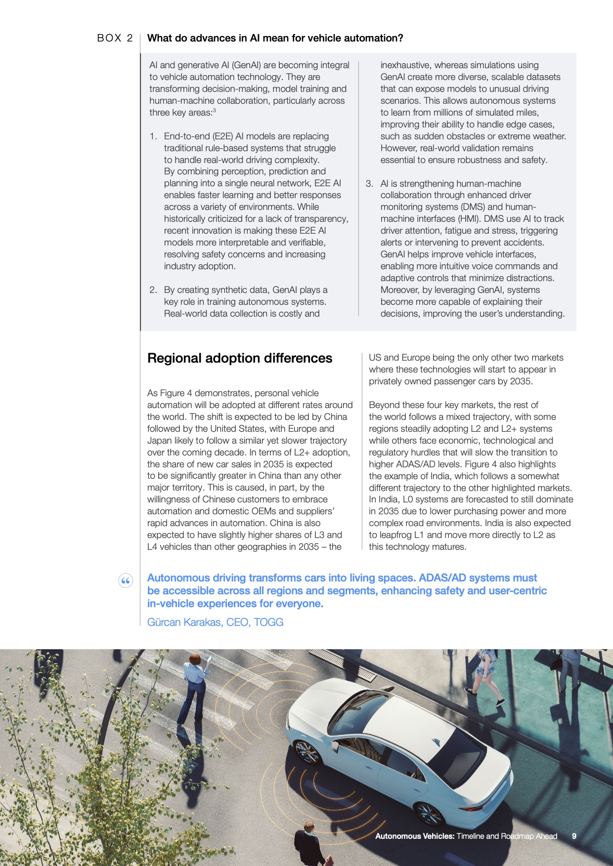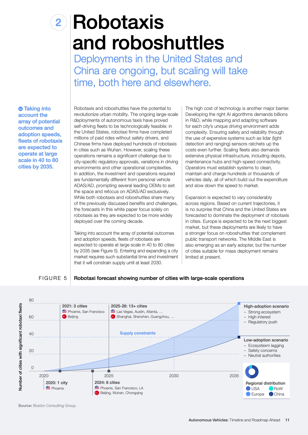 自动驾驶出租车和接驳车领域进展显著,已在中美多个城市进行部署并积累了大量里程。白皮书预测,到2035年,大规模自动驾驶出租车服务将在全球40至80个城市中实现规模化运营。其中,中国和美国预计将在城市投放中占据主导地位,欧洲和中东也将迎来发展机遇。