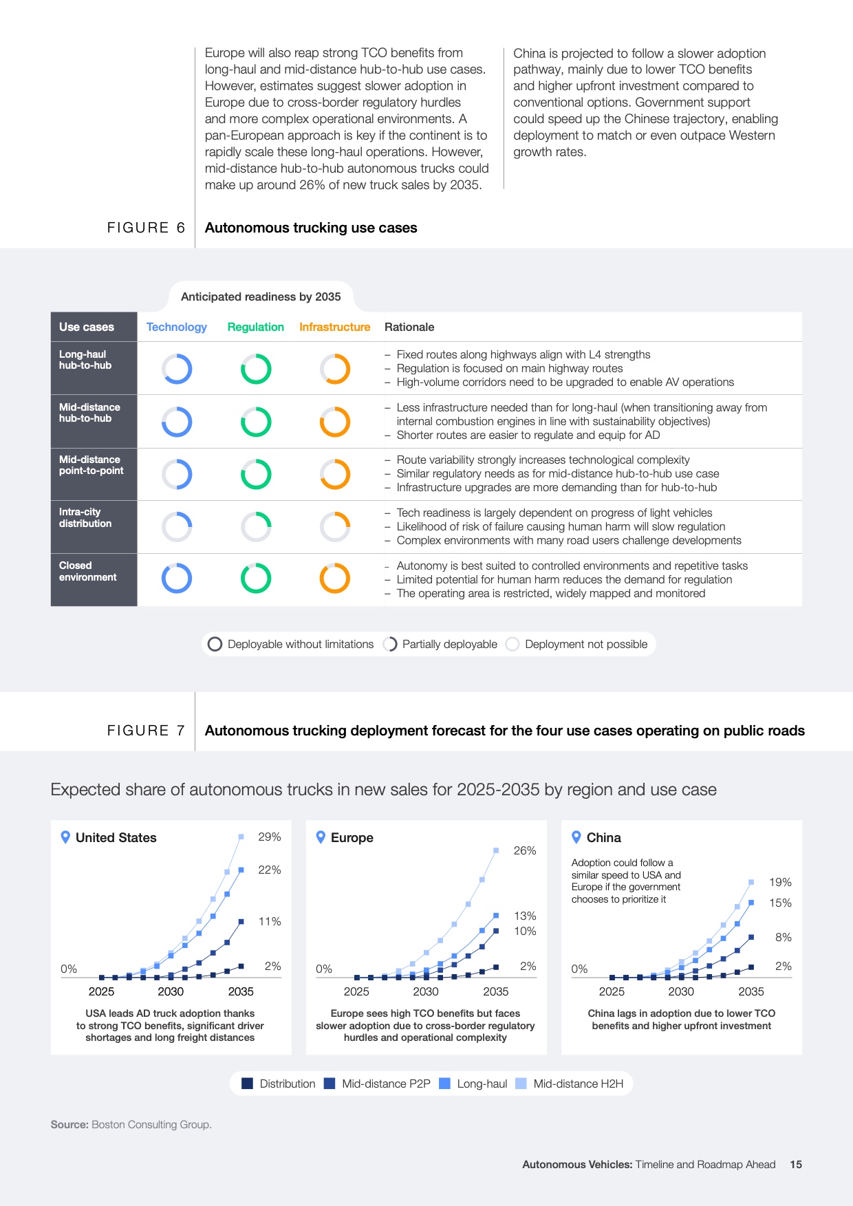 自动驾驶卡车被视为物流行业的变革力量,其发展已步入正轨,尤其在中美两国已进入测试及早期商业应用阶段。报告预计,到2035年,美国新卡车销量中将有近30%用于中途运输枢纽间线路的自动驾驶卡车,允许自动化驾驶的固定高速公路路线是实现这一目标的关键。