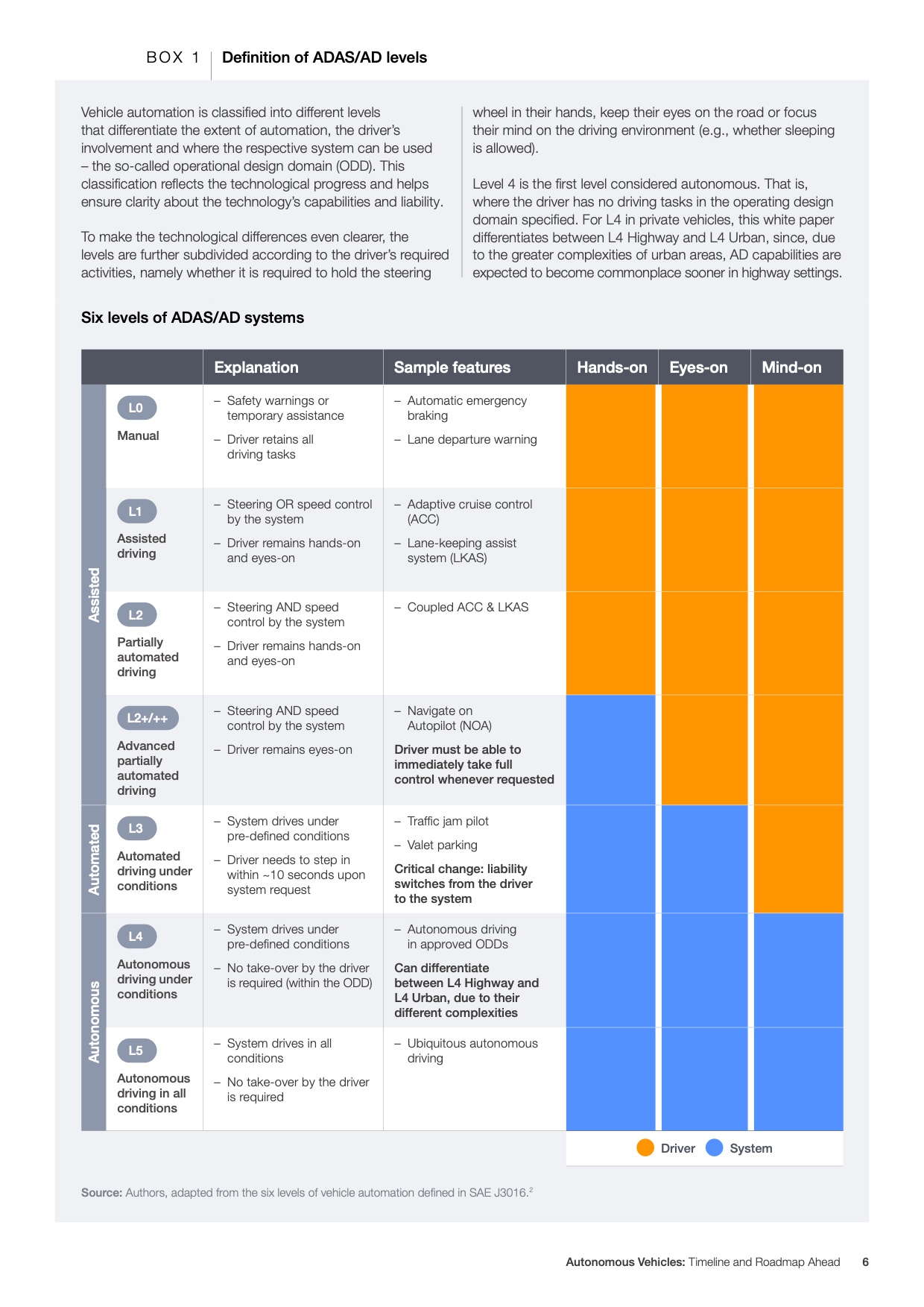 行业对自动驾驶的定义趋于严谨。美国国家公路交通安全管理局(NHTSA)倾向使用“自动化驾驶系统”,并指出行业标准下,“自动驾驶”一词不适用于描述所有自动化级别。世界经济论坛与波士顿咨询公司的白皮书将高级驾驶辅助系统(ADAS)和自动驾驶(AD)系统划分为六个等级,仅最高两个等级被视为“自动”驾驶。