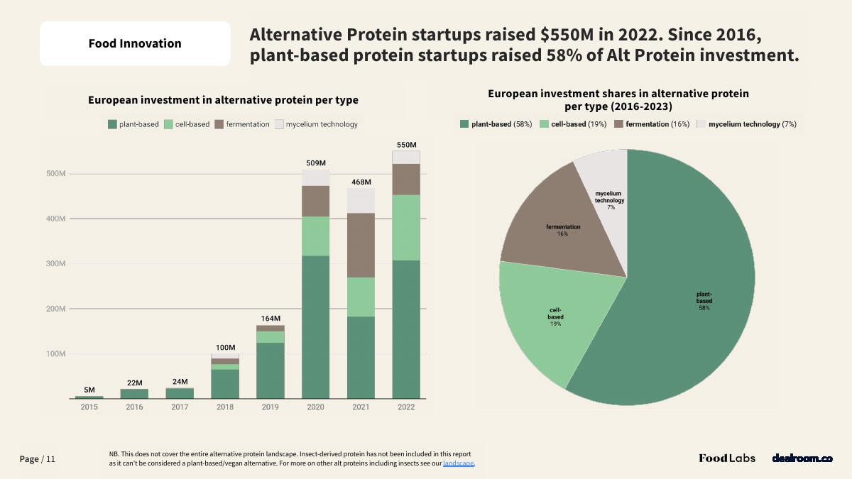 替代蛋白质创业公司在2022年融资5.5亿美元。自2016年以来,植物蛋白初创公司获得了替代蛋白质投资的 58%。
