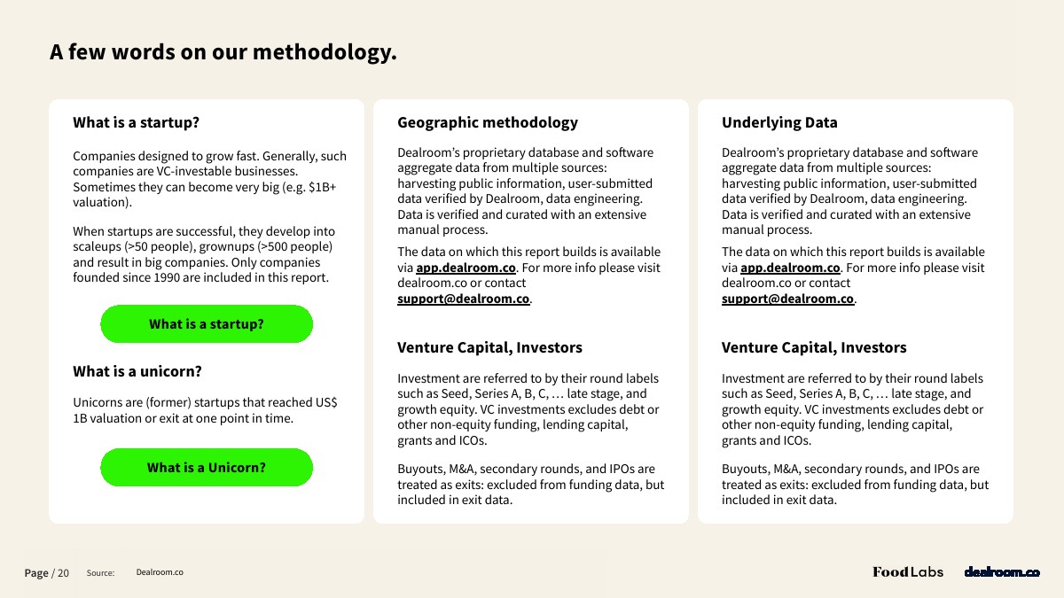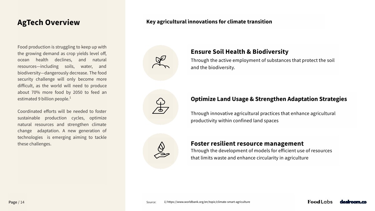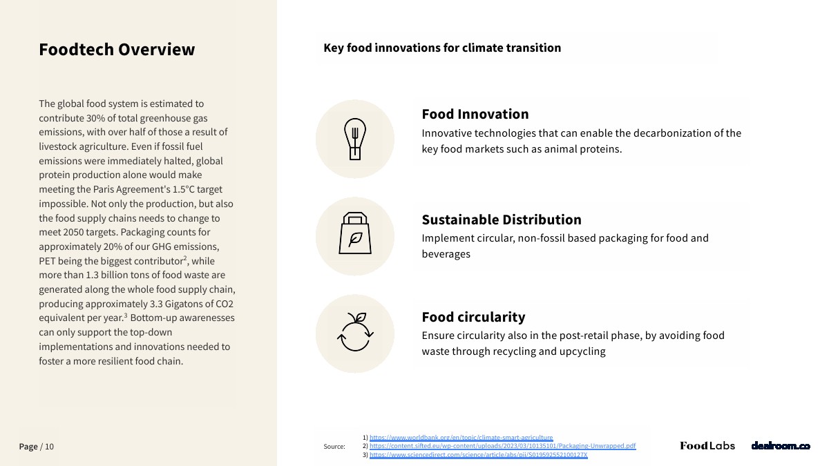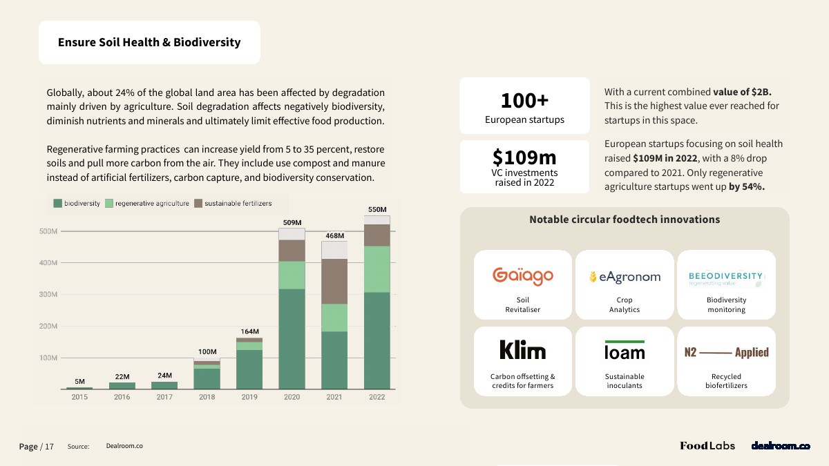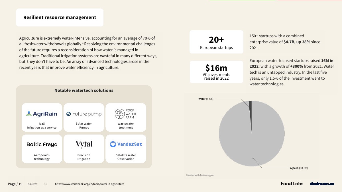 由于这些原因,无论在公共空间还是在私人空间,粮食问题越来越多地被纳入气候主题。气候食品科技初创公司在风投领域也获得了发展势头。Dealroom分析了欧洲食品科技与气候创业场景的现状,并确定了16个领域的340多家初创公司,支持向可持续食品系统的过渡。