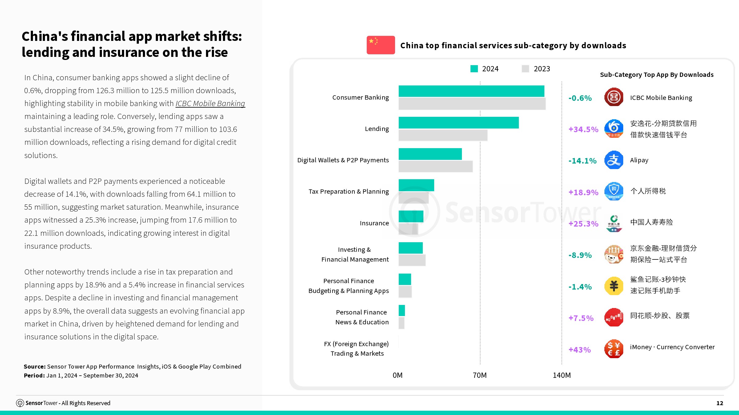 在美国,数字钱包和P2P支付在下载量方面领先,它们的下载量下降了4.7%,从1.127亿次下降到1.074亿次,但仍然很受欢迎。消费者银行应用也经历了4.3%的小幅下降。