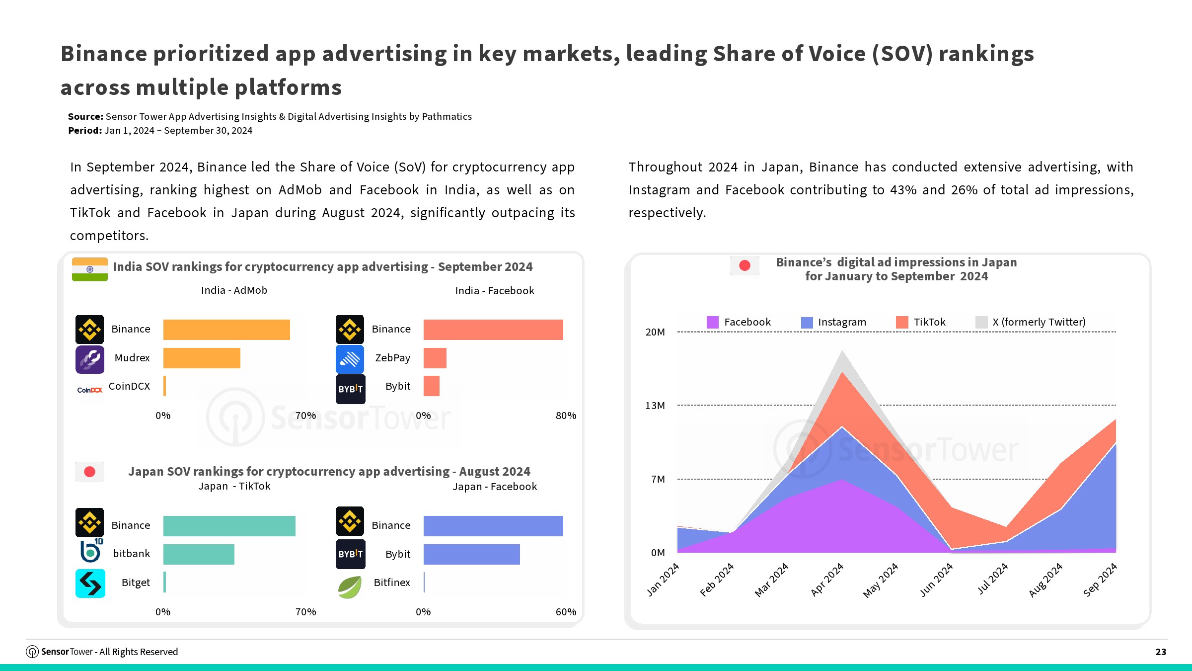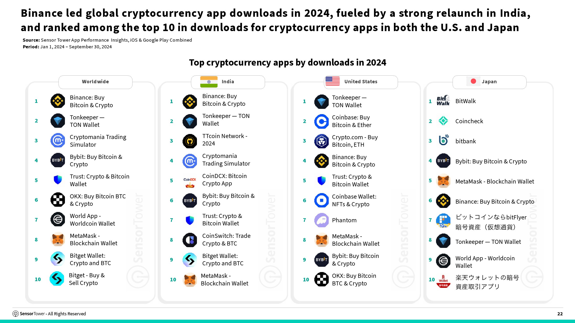 2024年,币安在全球加密货币应用下载量方面处于领先地位,并在美国和日本的加密货币应用下载量上排名前十。