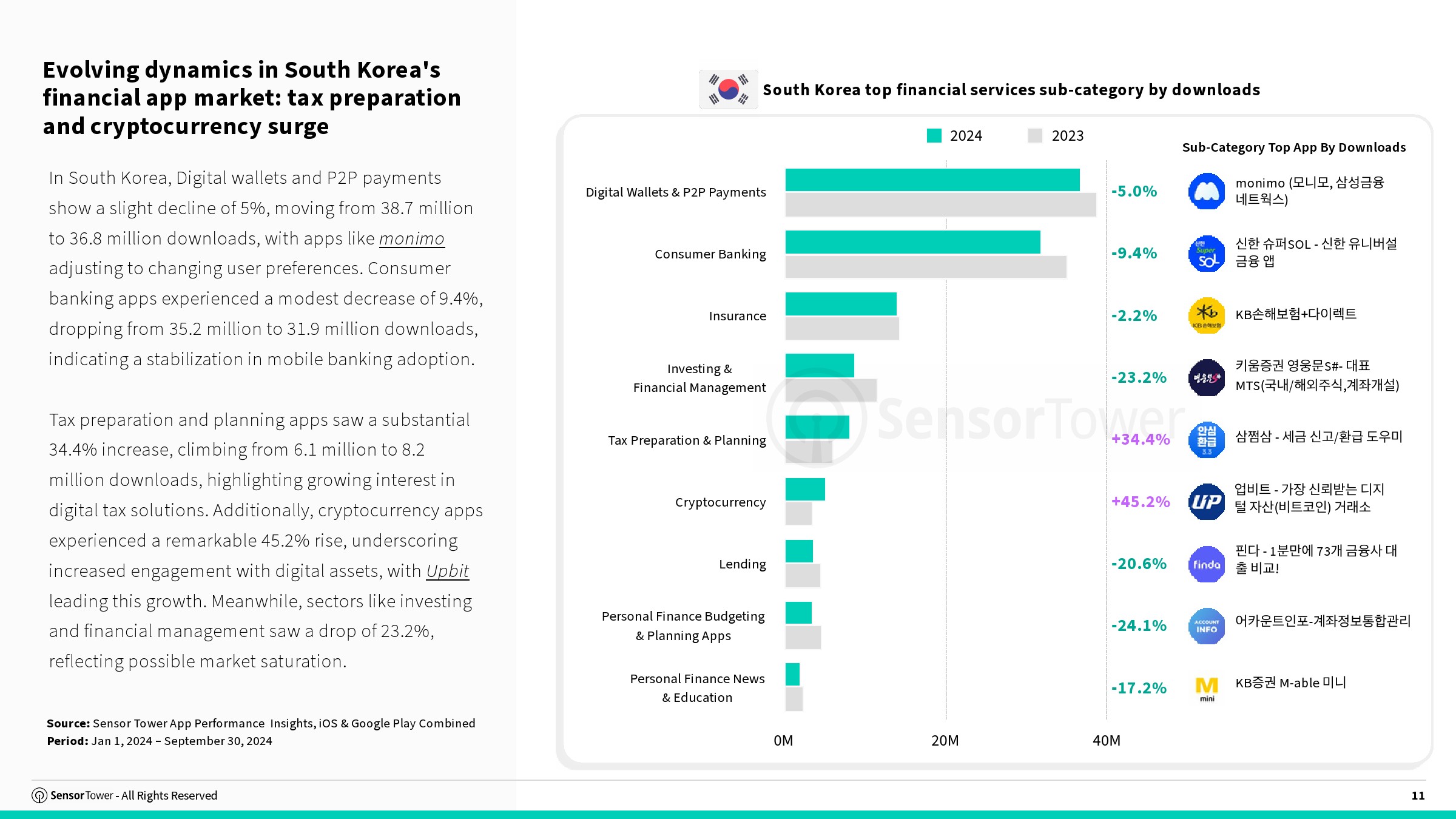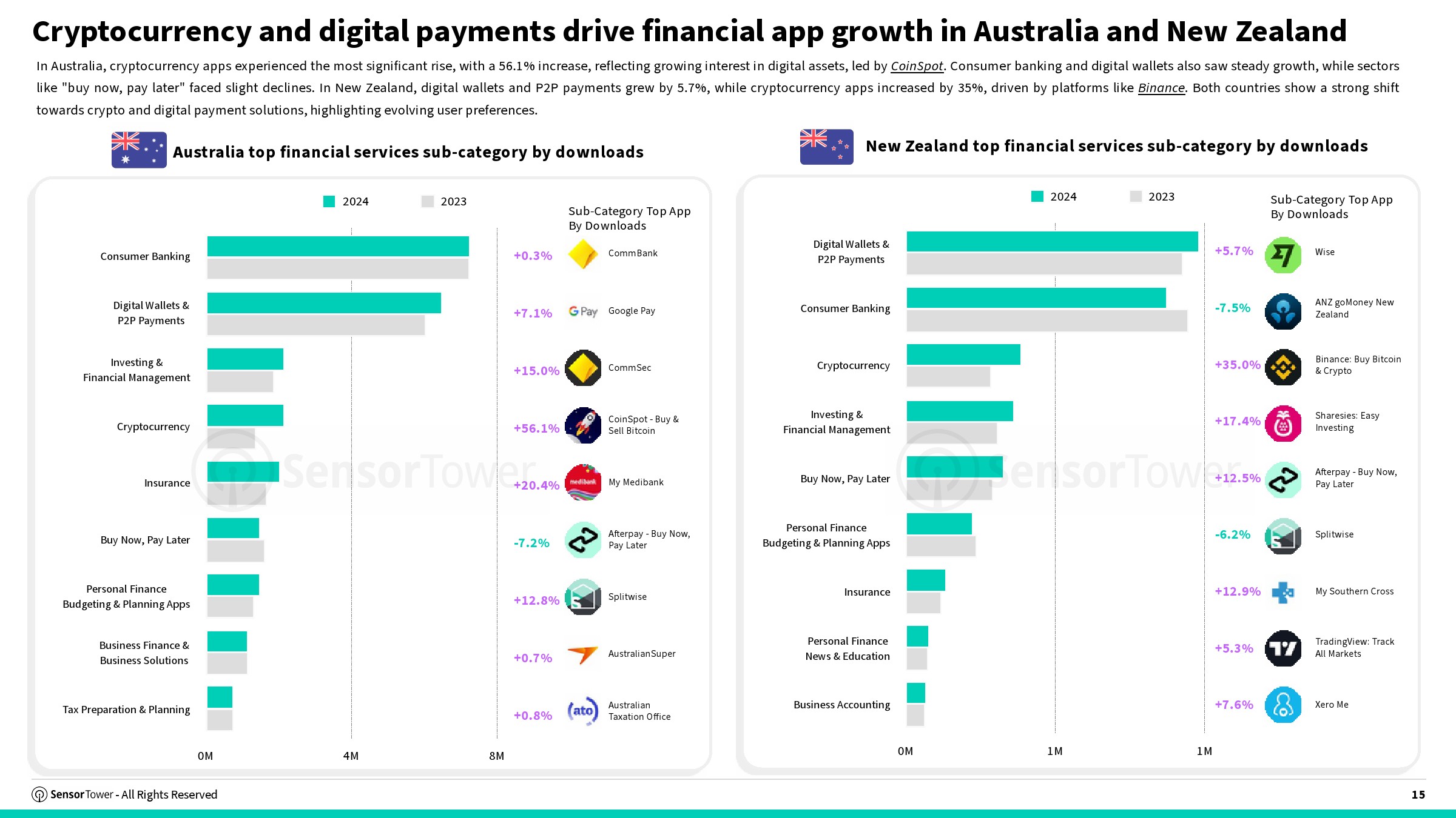 日本的投资和理财类应用小幅增长4.3%,下载量从700万上升至730万次。此外,加密货币应用程序见证了30.8%的大幅增长。