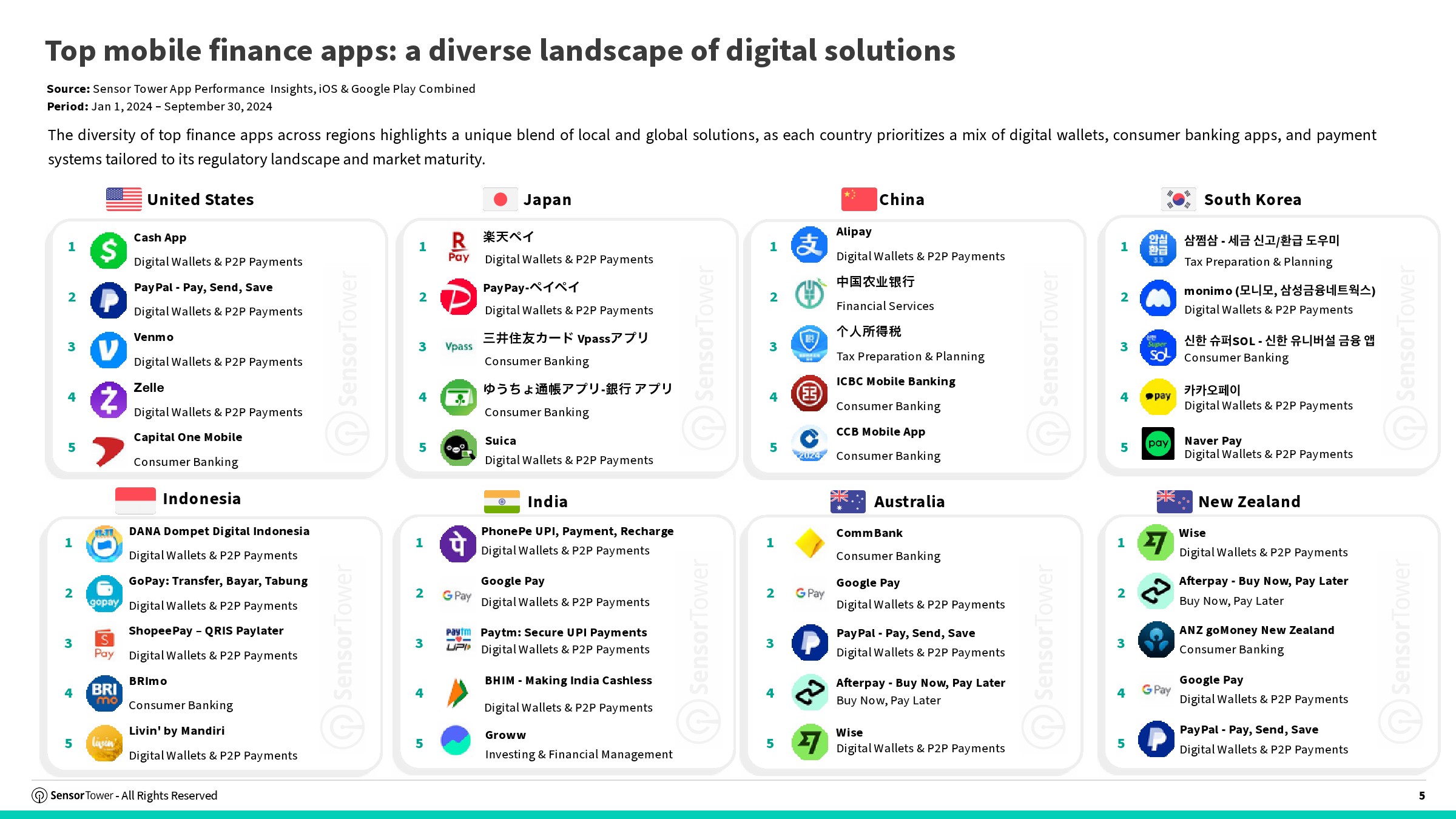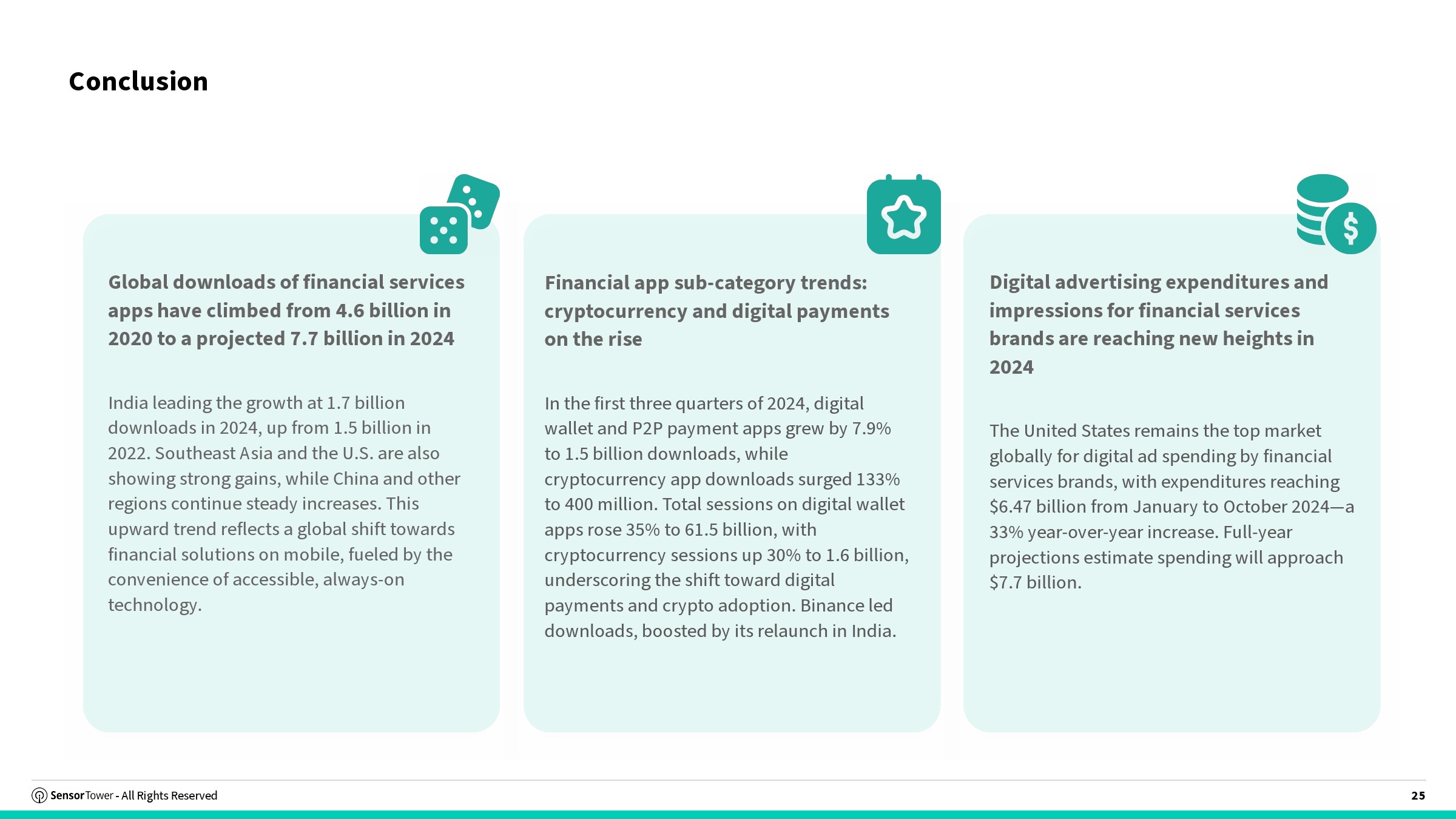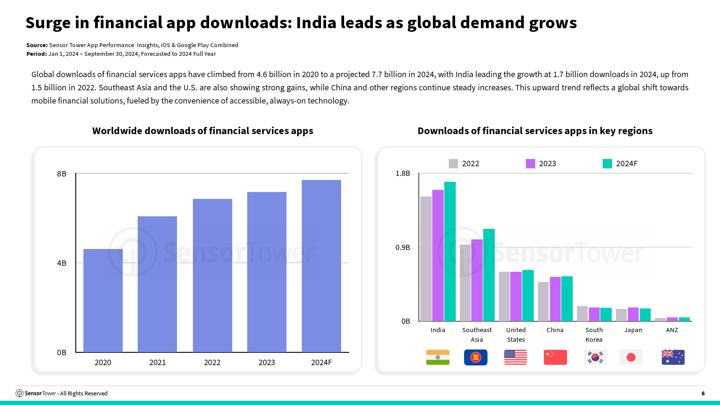 全球金融服务应用程序的下载量已从2020年的46亿次增长至2024年的77亿次,其中印度的下载量增长最快,从2022年的15亿次增长到2024年的17亿次。