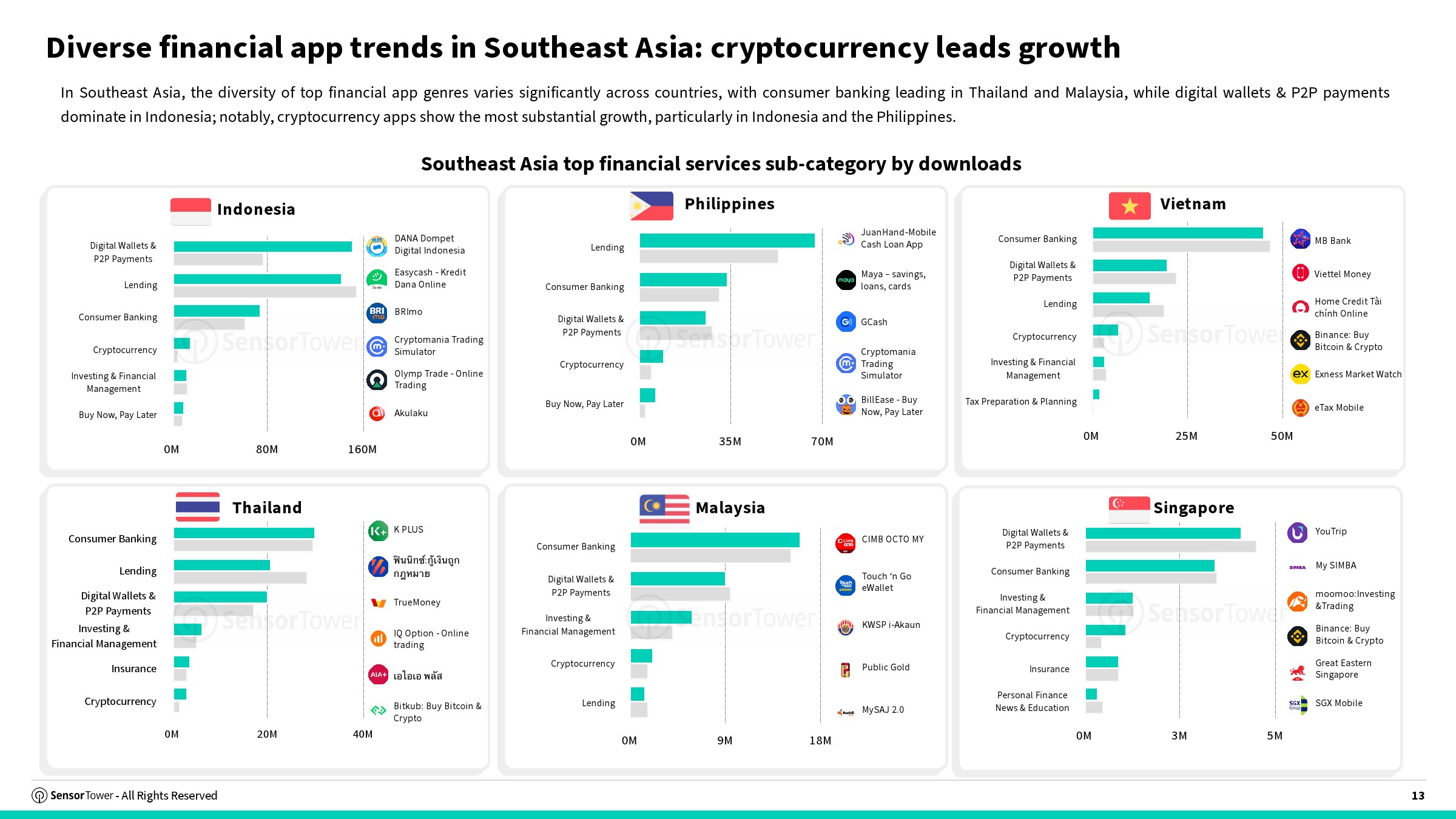 在东南亚,顶级金融应用的多样性因国家而异,泰国和马来西亚的消费者银行应用占主导地位,而印度尼西亚的数字钱包和P2P支付应用占主导地位;值得注意的是,加密货币应用程序的增长最为显著,尤其是在印度尼西亚和菲律宾。