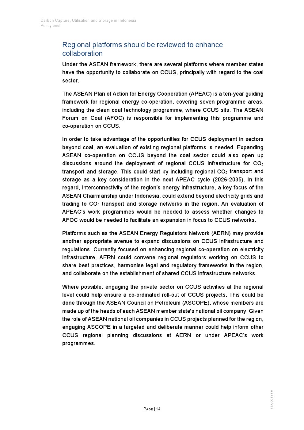需要对现有的东盟区域能源合作平台进行审查,以协调二氧化碳运输和储存网络方面的机会,例如在下一轮东盟能源合作行动计划或通过东盟能源监管机构网络。